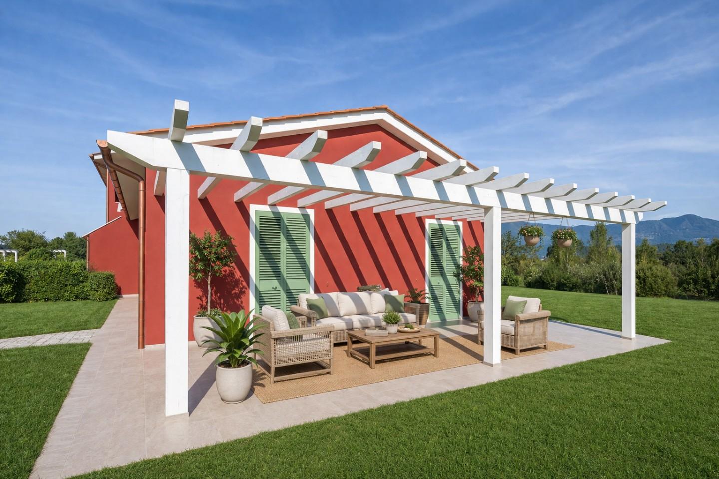 pergolato e grande giardino con posti auto