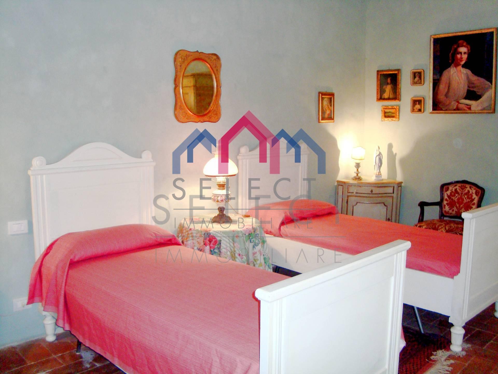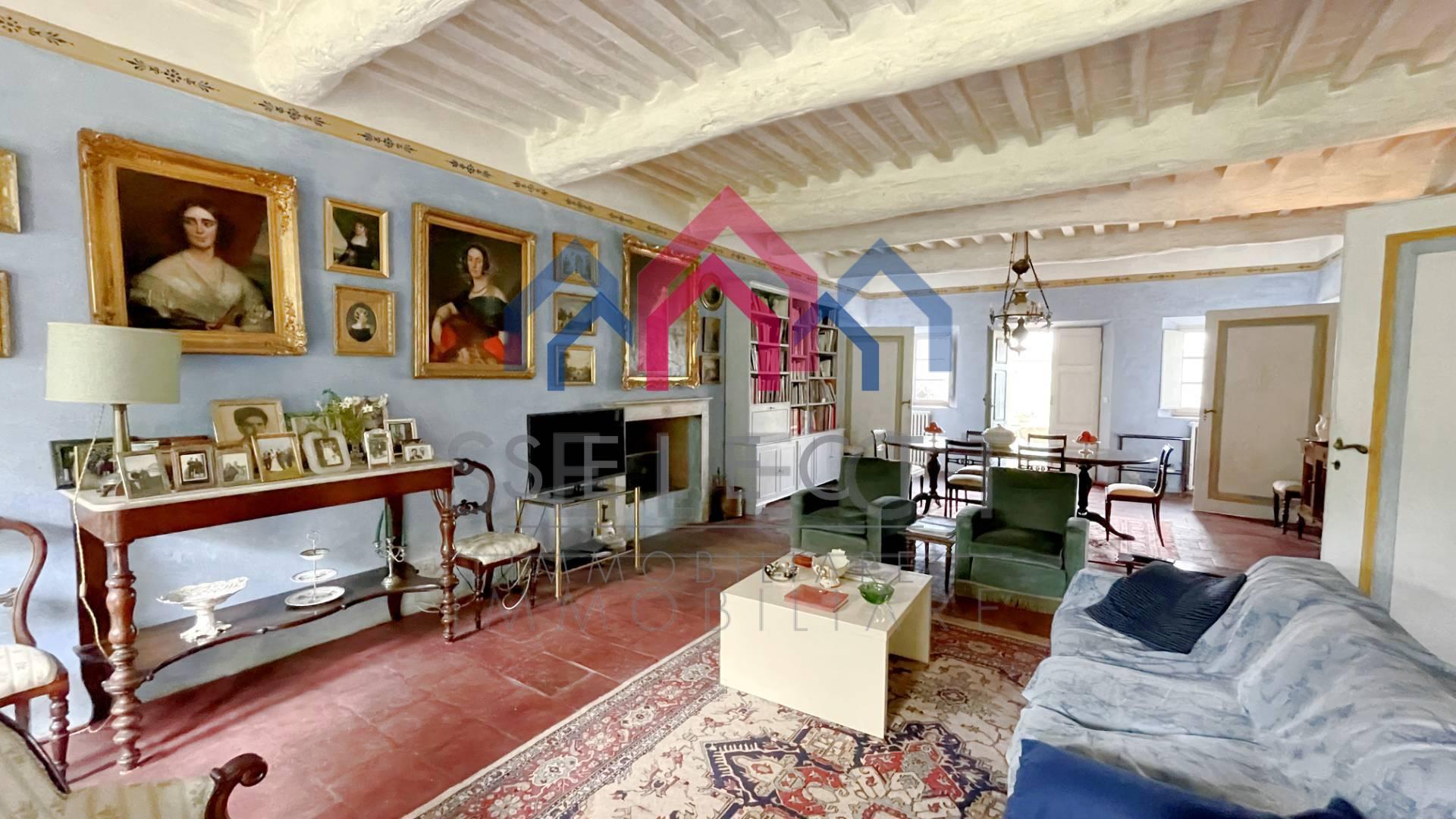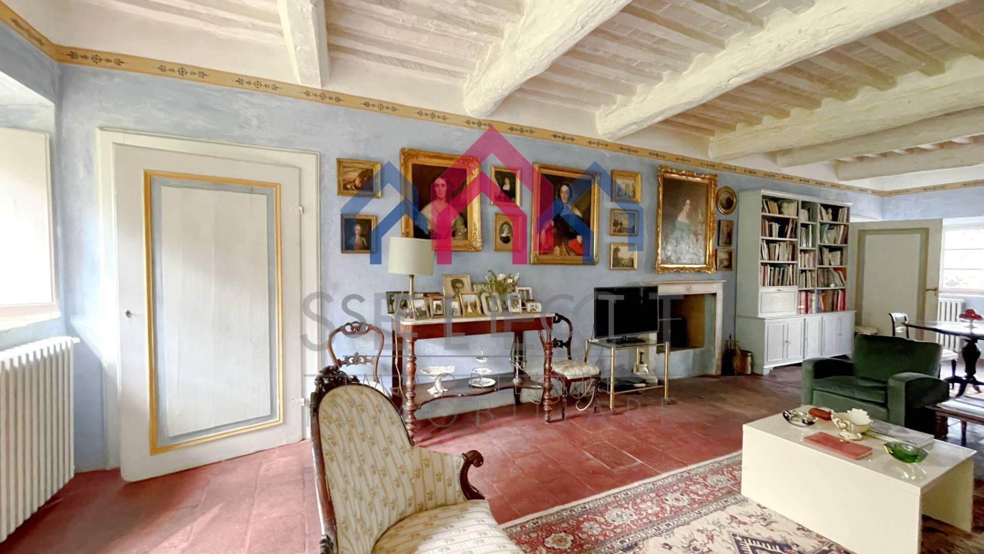 La villa è di pianta rettangolare, si sviluppa prevalentemente a est-ovest, arricchita da una bella terrazza panoramica rivolta ed est verso la valle sottostante. In ottime condizioni manutentive interne ed esterne, la villa si sviluppa su 3 livelli, sottotetto abitabile compreso, oltre alle cantine e ai locali accessori al piano seminterrato. L’ingresso principale sul fronte ovest avviene da un importante portale, cui si accede da una scalinata esterna in pietra; al piano terra entriamo nell’ampio soggiorno con camino pregevolmente affrescato, cucina abitabile con camino, “acquaio” in pietra ed i vecchi fornelli in muratura sapientemente recuperati, disimpegno, bagno rivestito in marmo bianco di Carrara con doccia e due camere matrimoniali completamente affrescate, oltre alla grande terrazza esterna con gazebo molto piacevole per passare delle serate estive all’aperto; da un disimpegno e dall’ampia scalinata in pietra con corrimano in ferro battuto arriviamo al piano primo composto da salone, quattro camere matrimoniali ed un bagno anch’esso con doccia; al piano secondo sottotetto o soffitta troviamo un ampio vano corrispondente al salone sottostante, altri quattro vani ed un ripostiglio, se necessario tutti trasformabili in vani uso camera o altro. Al piano seminterrato, a cui si accede sia con accesso esterno che dalla cucina, abbiamo tre ampi vani uso cantine con bellissimo arco in pietra e mezzane, ed altro piccolo vano uso “caciaia” per la stagionatura di formaggi e salumi. La villa viene venduta non arredata, se interessati è possibile effettuare una trattativa separata. Superficie lorda Villa mq. 640,00. Superficie lorda Cantine mq. 115,00.