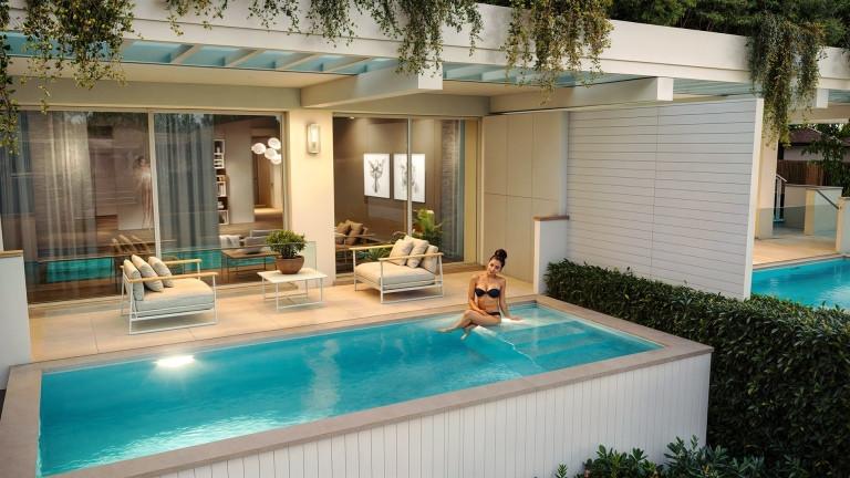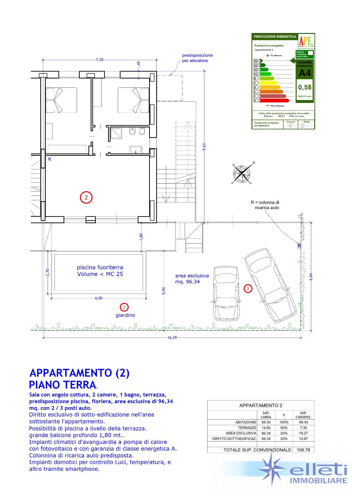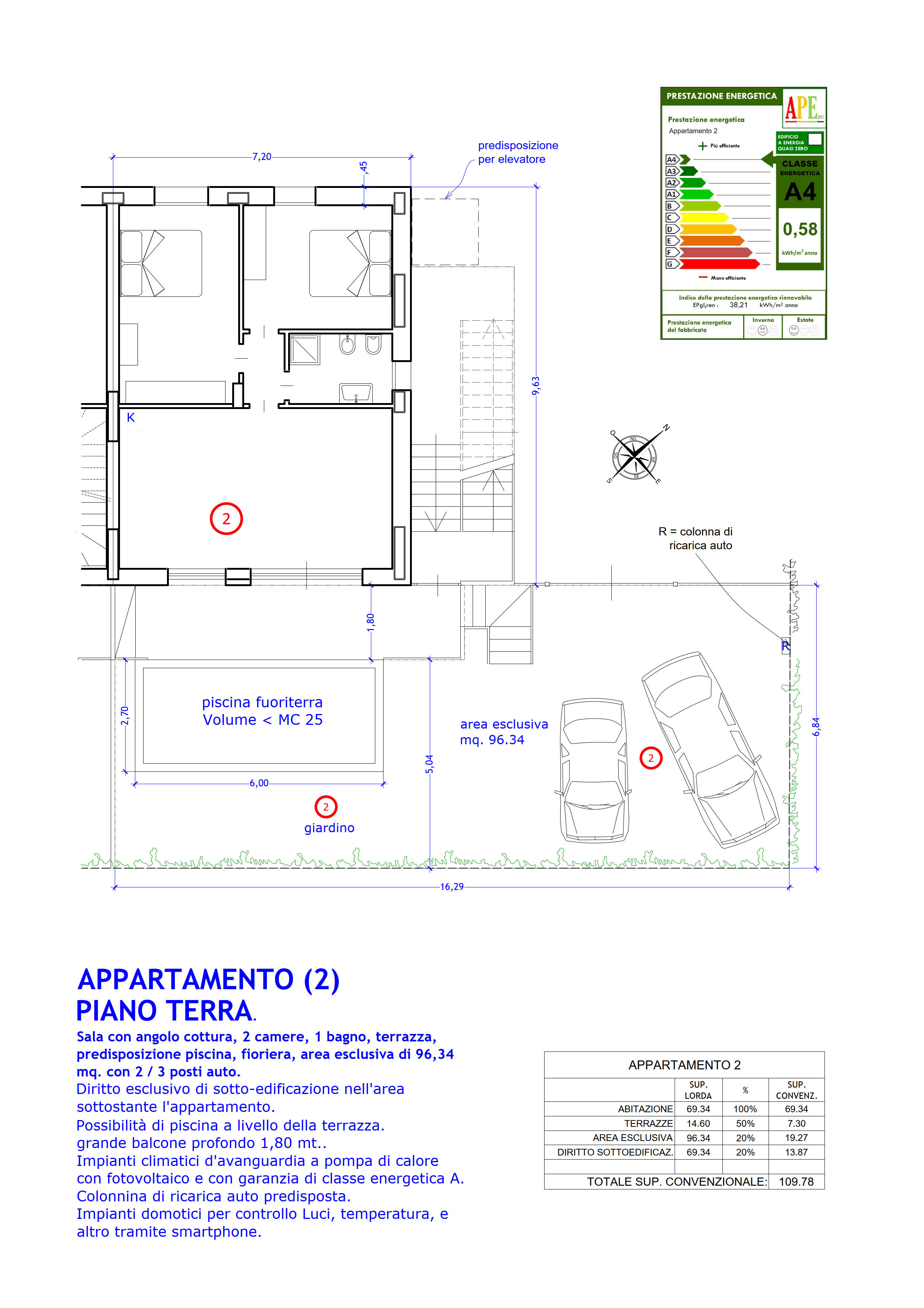 B) Appartamento a piano terra con giardino e posti auto interni, predisposizione piscina, due camere e terrazza.