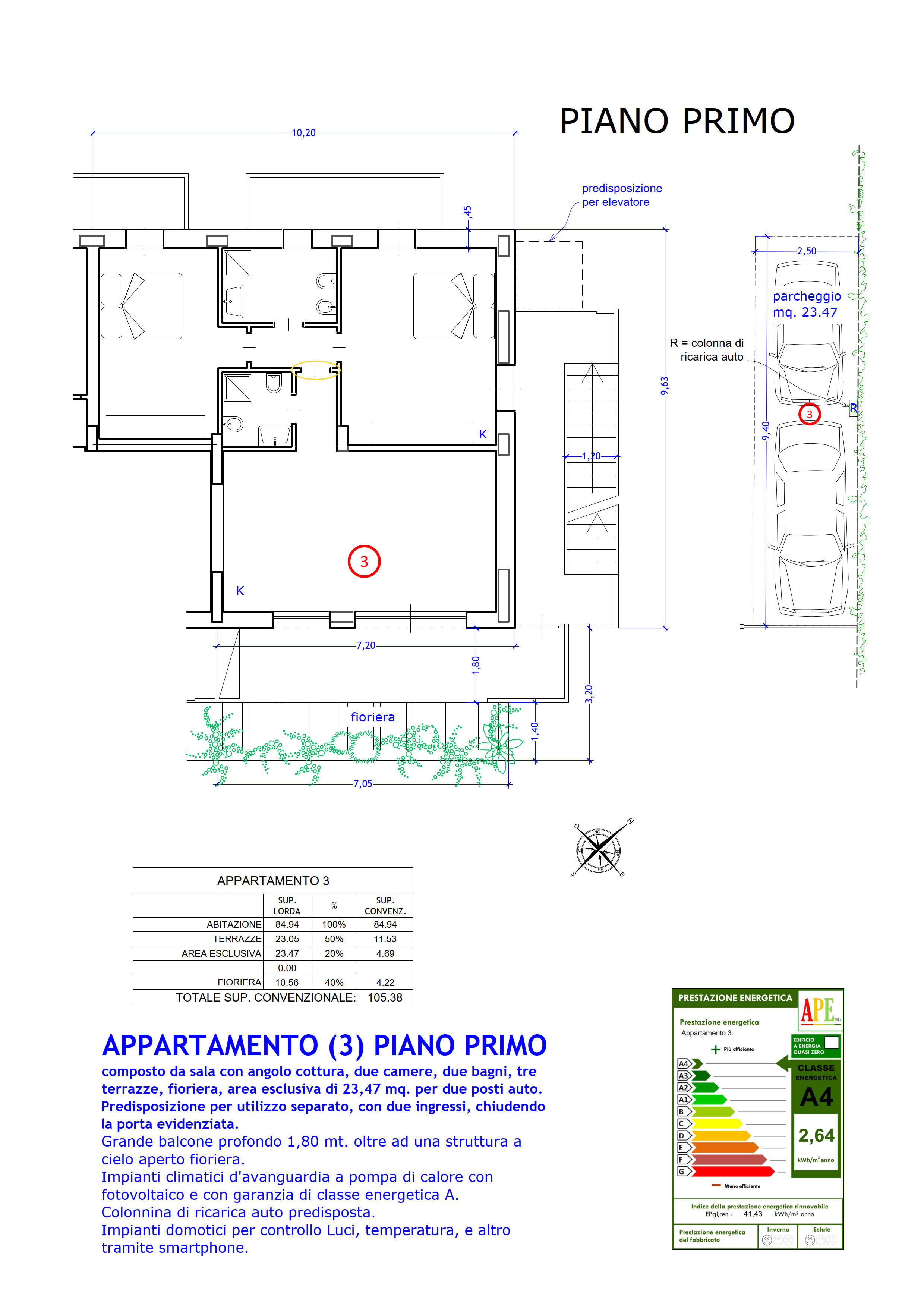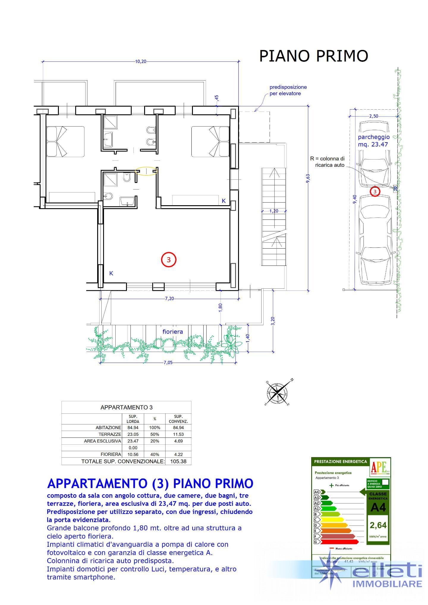 C) Appartamento a piano primo con tre balconi, due camere, doppi servizi e due posti auto in area esclusiva.