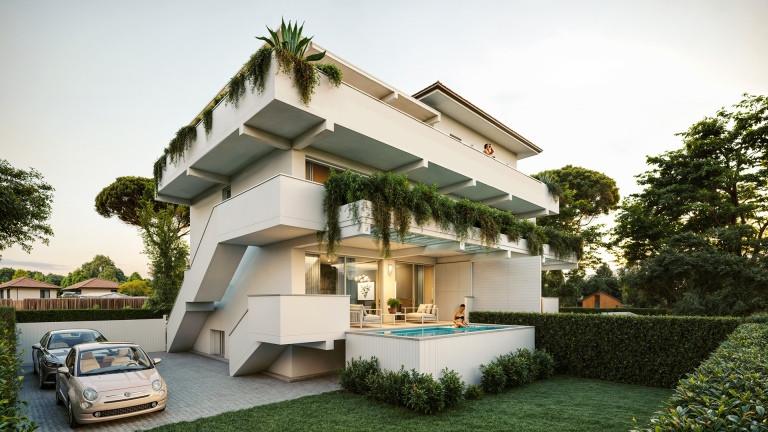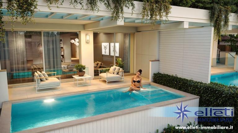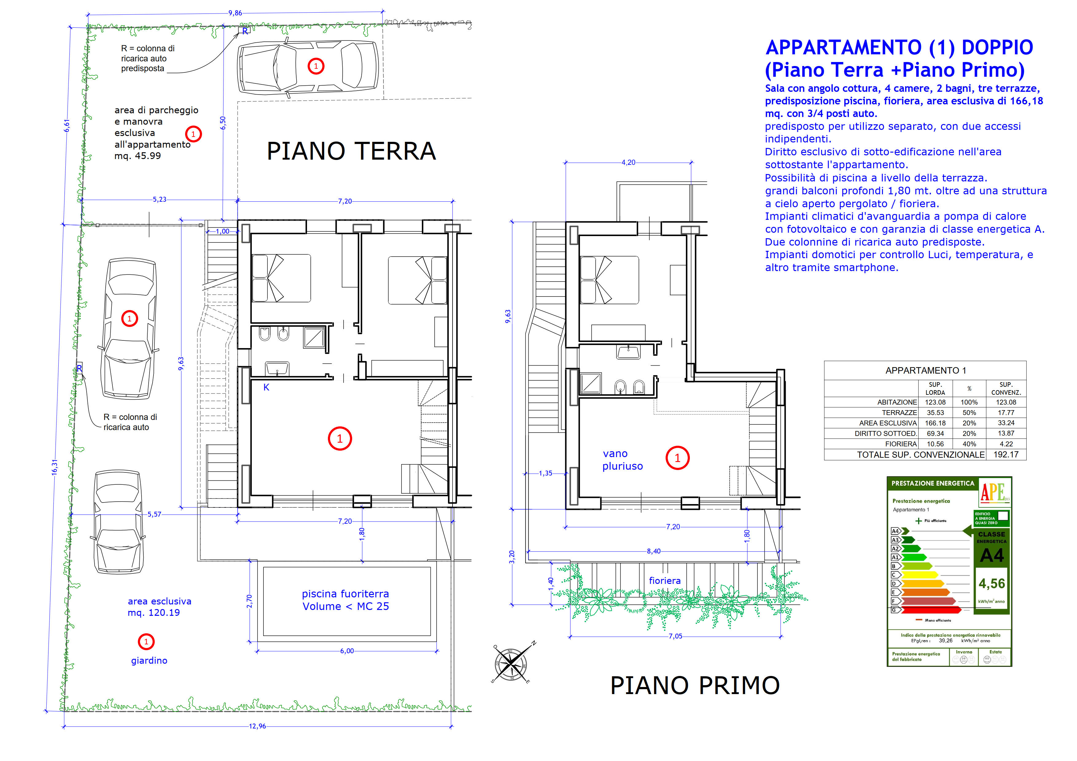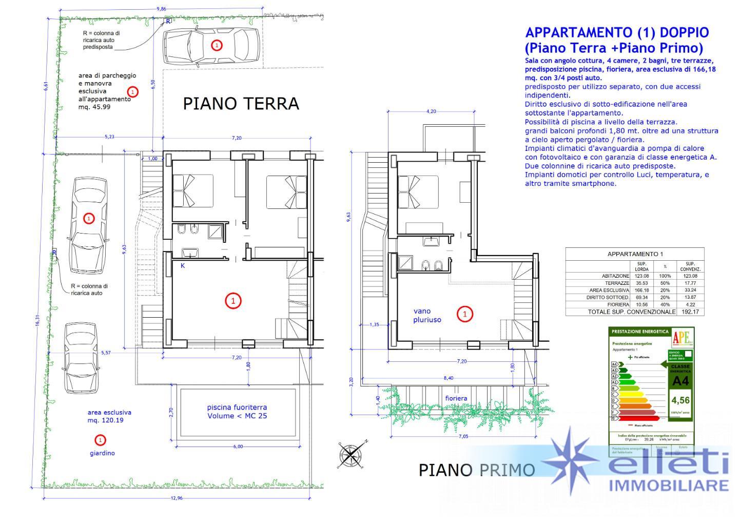 A) Appartamento di tipologia “Duplex” dislocato su due livelli, piano terra rialzato e piano primo con 3/4 camere da letto, doppi servizi, giardino con predisposizione piscina e posti auto interni, terrazza e doppio ingresso interno/esterno.