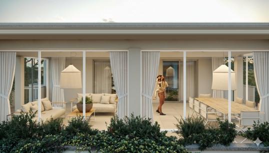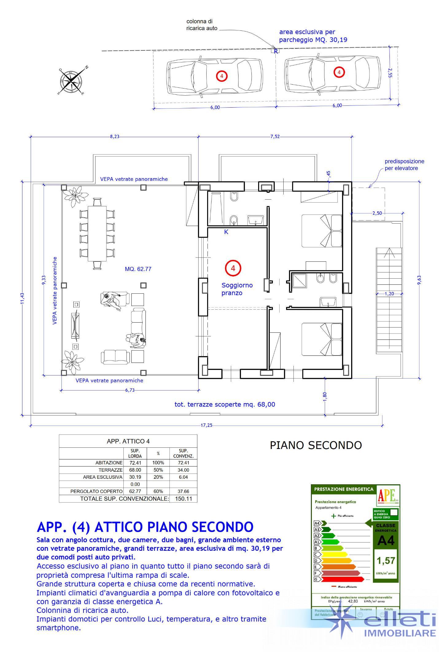 D) Appartamento al piano secondo ed ultimo (ATTICO), con grande ambiente esterno di cui un pergolato coperto di 62 mq, terrazze e grandi vetrate panoramiche, due camere, doppi servizi e due comodi posti auto in area esclusiva.