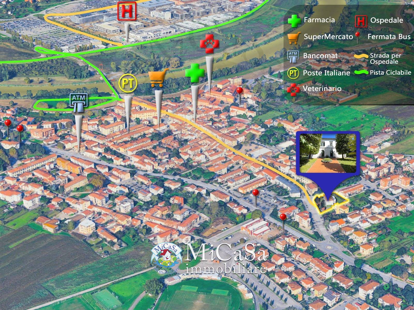 Il contesto circostante è tranquillo e di prestigio, con la presenza di villette e residenze signorili. La proprietà si trova in prossimità della via Tosco--Romagnola e del Ponte delle Bocchette, pur restando defilata dal traffico, in una posizione riservata e silenziosa.