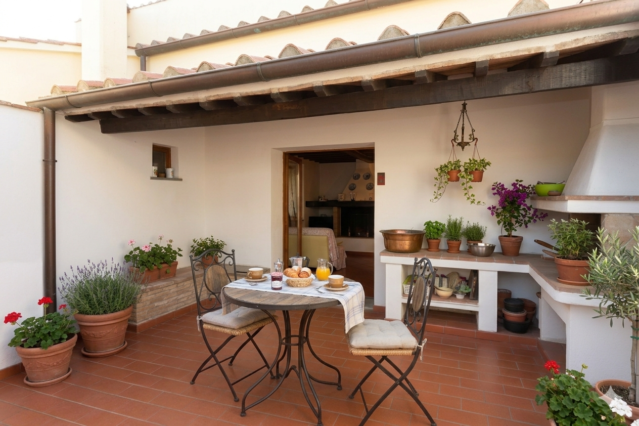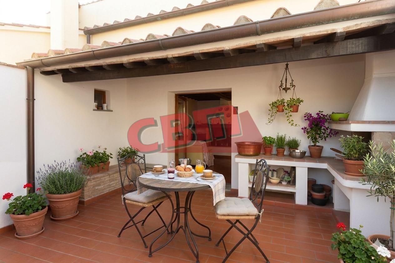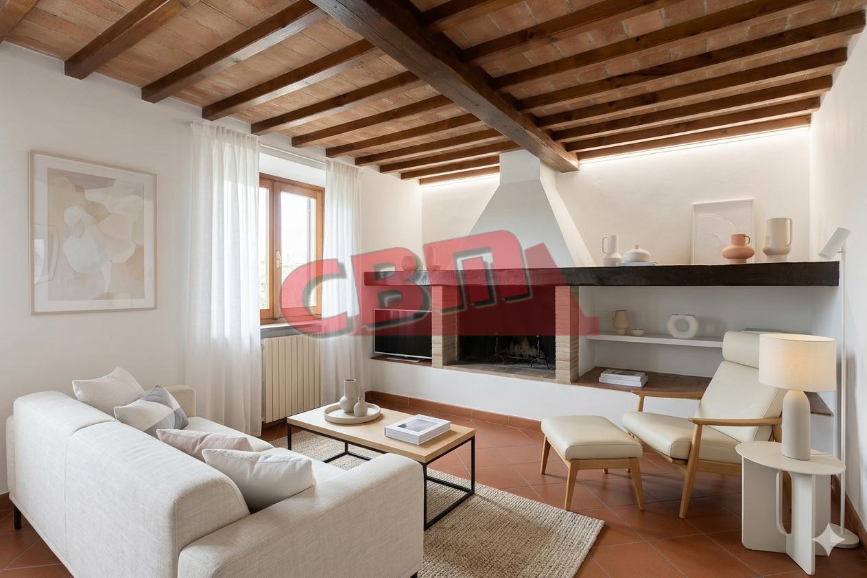 Tutto il piano inferiore è pavimentato in pregiato cotto dell'Impruneta e il piano superiore in parquet. Abbiamo insrito fra le foto reali alcuni render (denominati dettagli) al solo scopo di suggerire alcune semplici soluzioni di arredo che rendono una diversa immagine della casa.