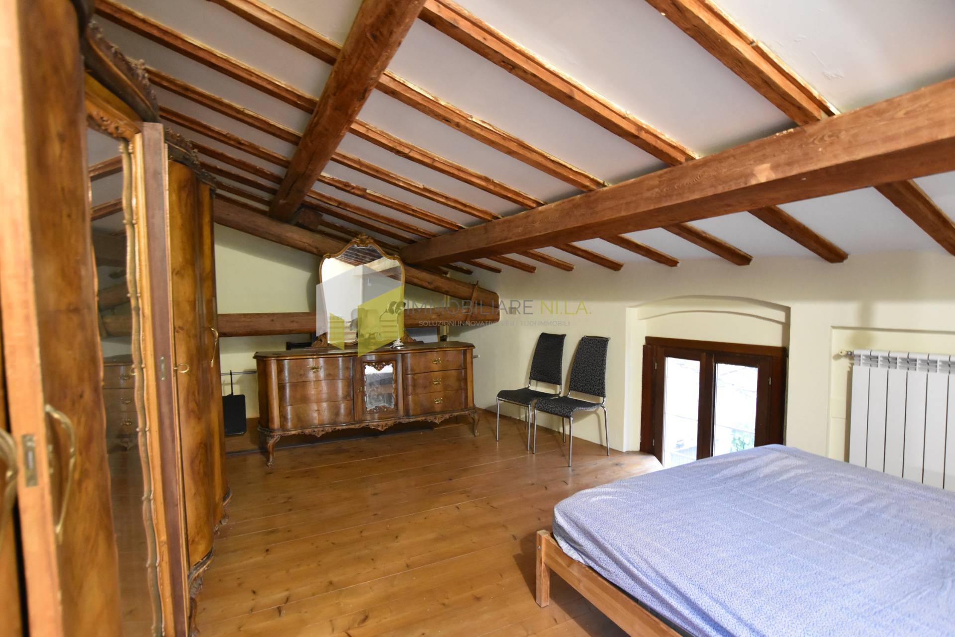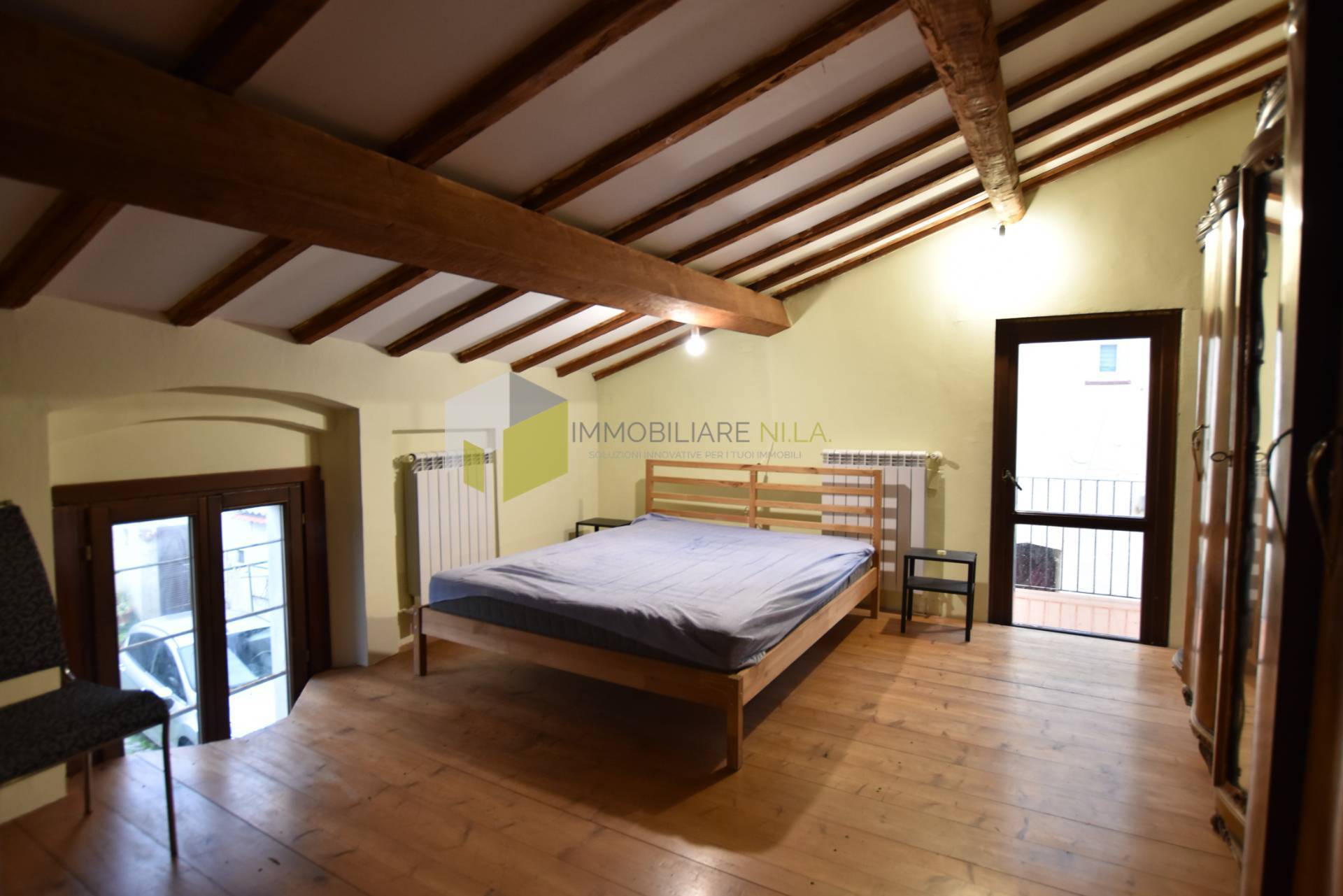Attraverso una scala in legno e metallo si raggiunge il piano soppalcato, dove troviamo una bella camera con accesso ad un balcone ed un ulteriore locale di deposito da poter sfruttare con alcune modifiche come seconda camera.