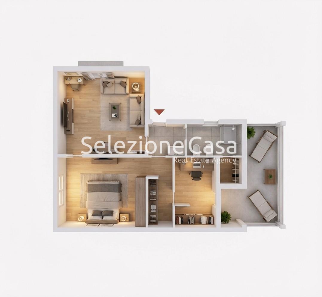 Ritornato abitazione si può comporre di un'ampia zona ingresso-soggiorno con angolo cottura, una camera da letto molto grande e quindi separabile con una cabina armadi, un bagno completo con doccia, uno studio o stanza di servizio, un ripostiglio ed una bella loggetta semiaperta per tutte le faccende domestiche e per riposarsi e mangiare all'aperto.