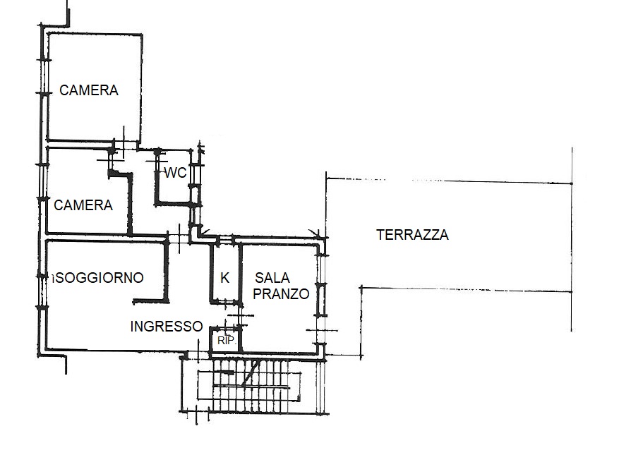 Composto da ingresso, soggiorno, cucinotto, sala pranzo (o studio) dal quale si accede alla terrazza di mq.50, corridoio, camera, cameretta, bagno con cabina doccia.