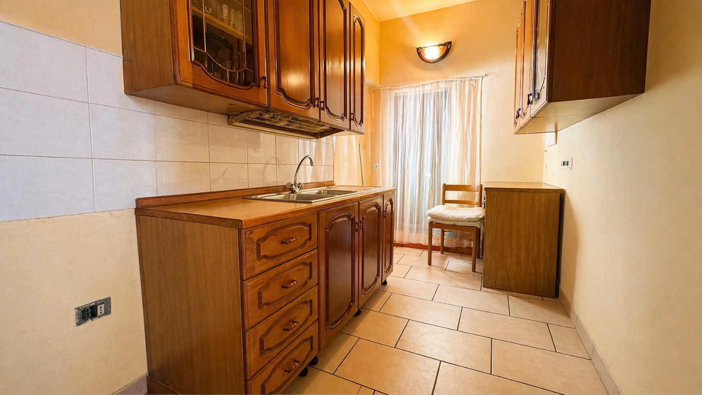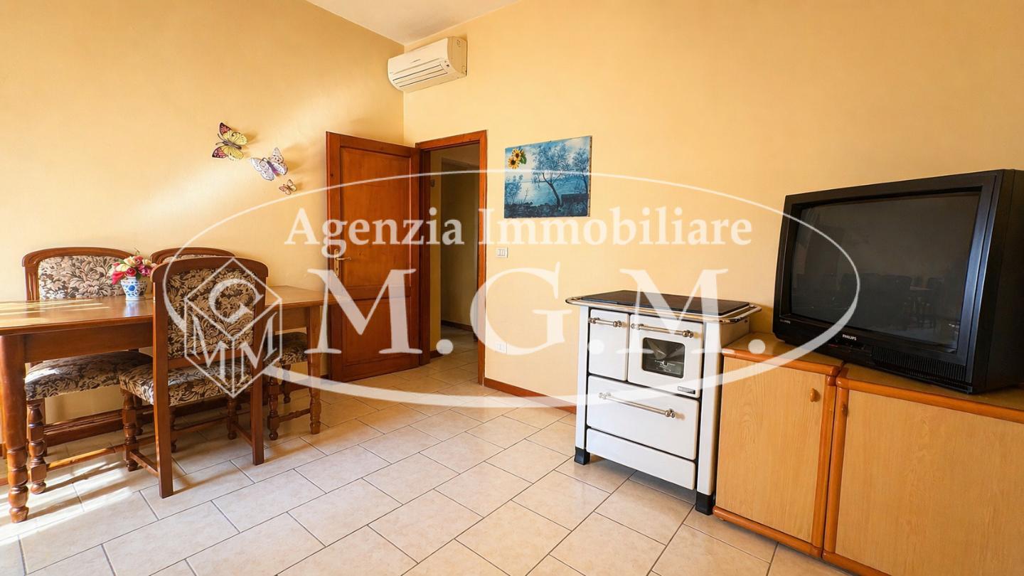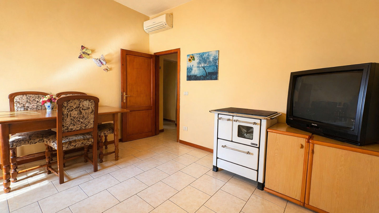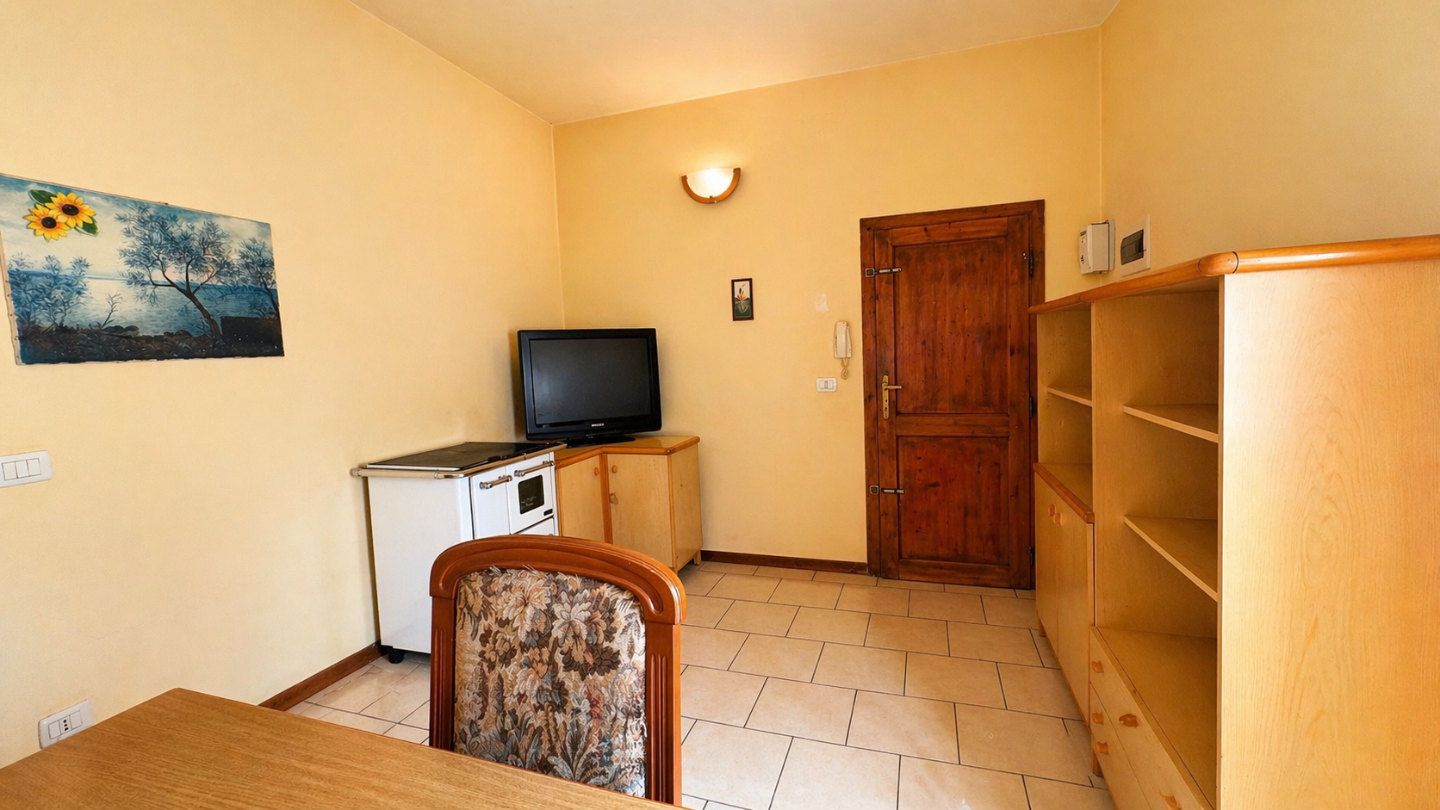 L’abitazione è composta da: ingresso in soggiorno- pranzo, cucinotto con piccolo balcone e comodo ripostiglio-dispensa , disimpegno notte, una spaziosa camera matrimoniale, una camerina e un bagno.
