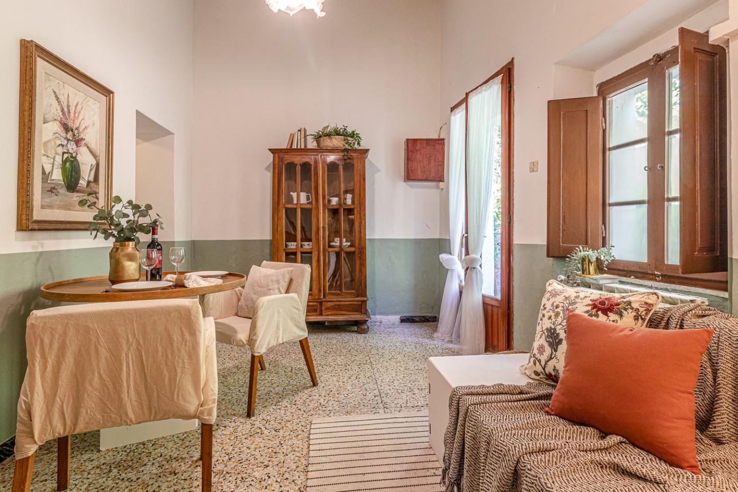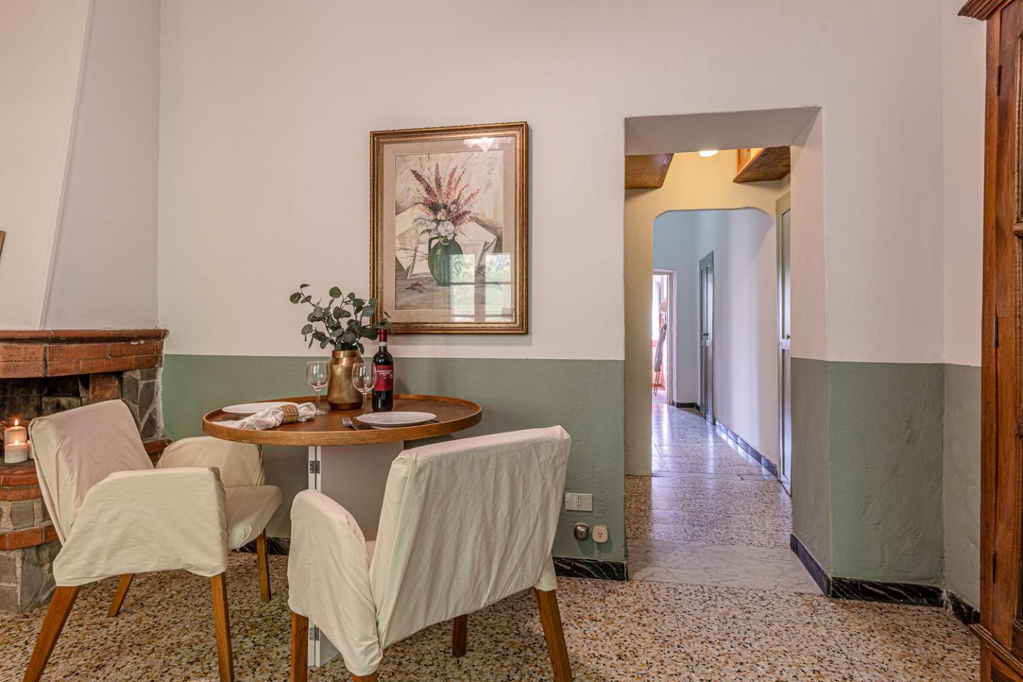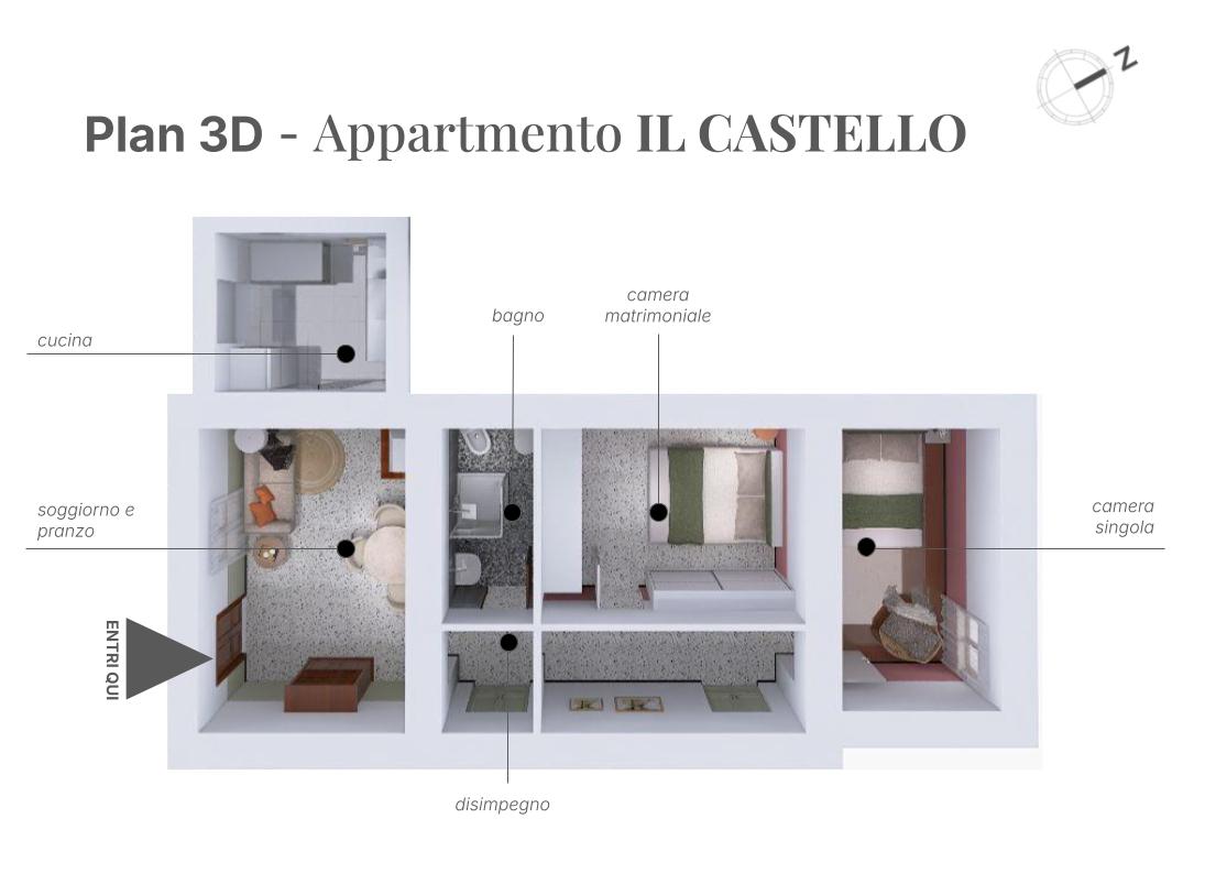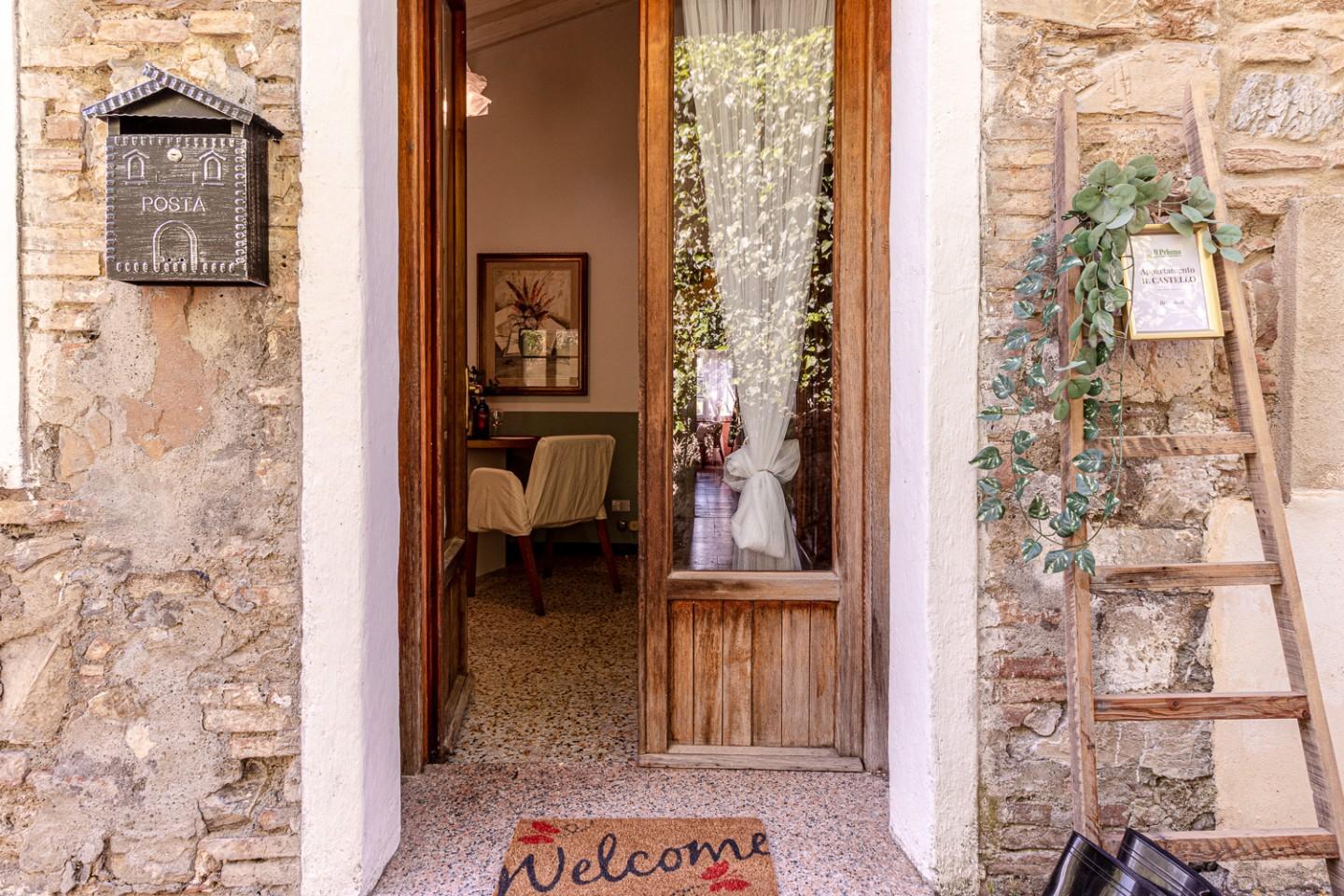 Lʼappartamento “Il Castelloˮ conserva i materiali di un tipico castello toscano che raccontano unʼidentità autentica: pavimenti in graniglia e cotto, soffitti con travi e travicelli tinteggiati di bianco, porte in legno color noce. Oggi richiede lavori di manutenzione o una