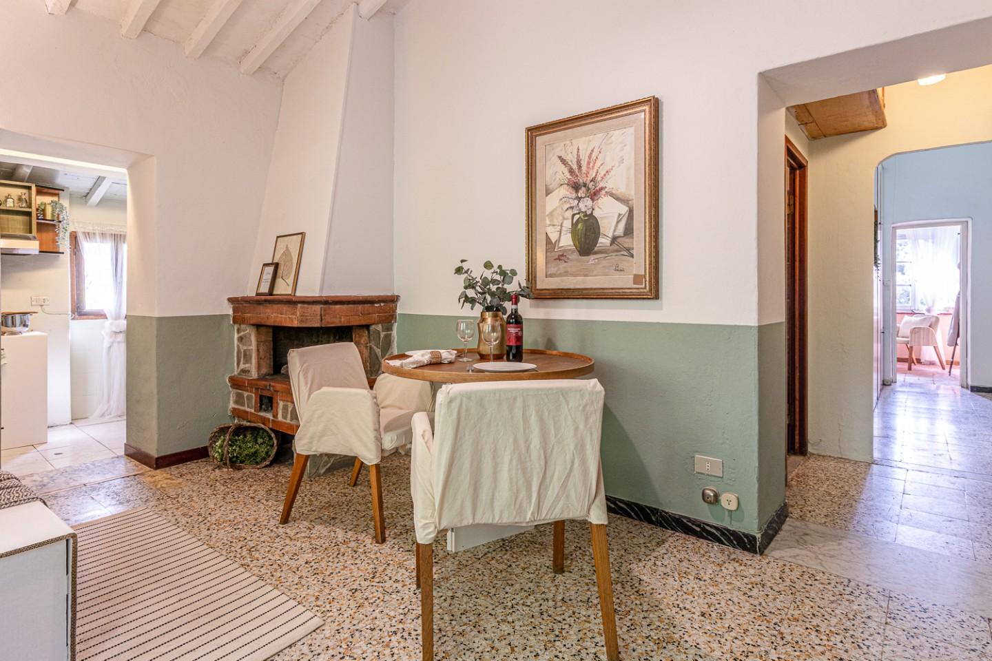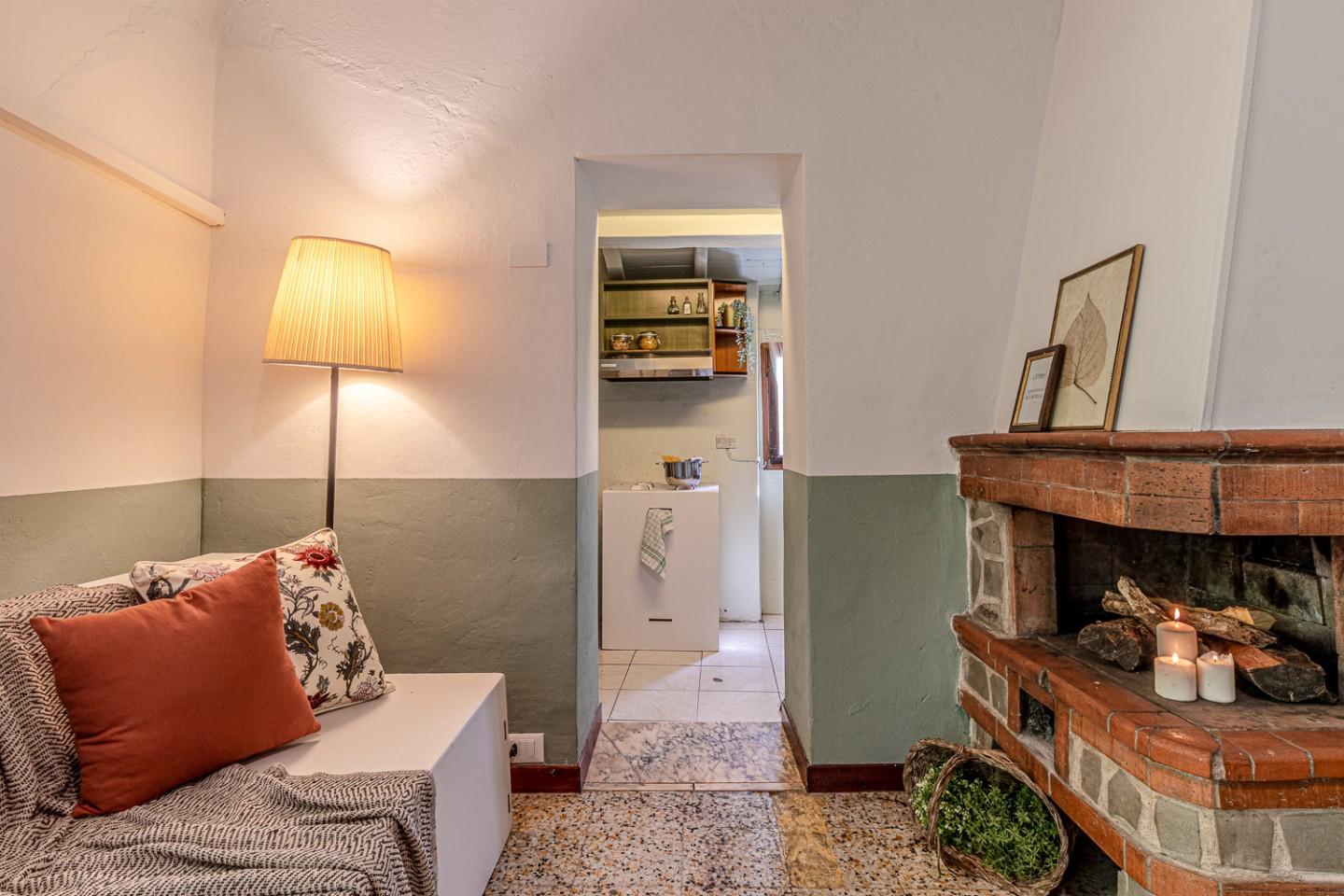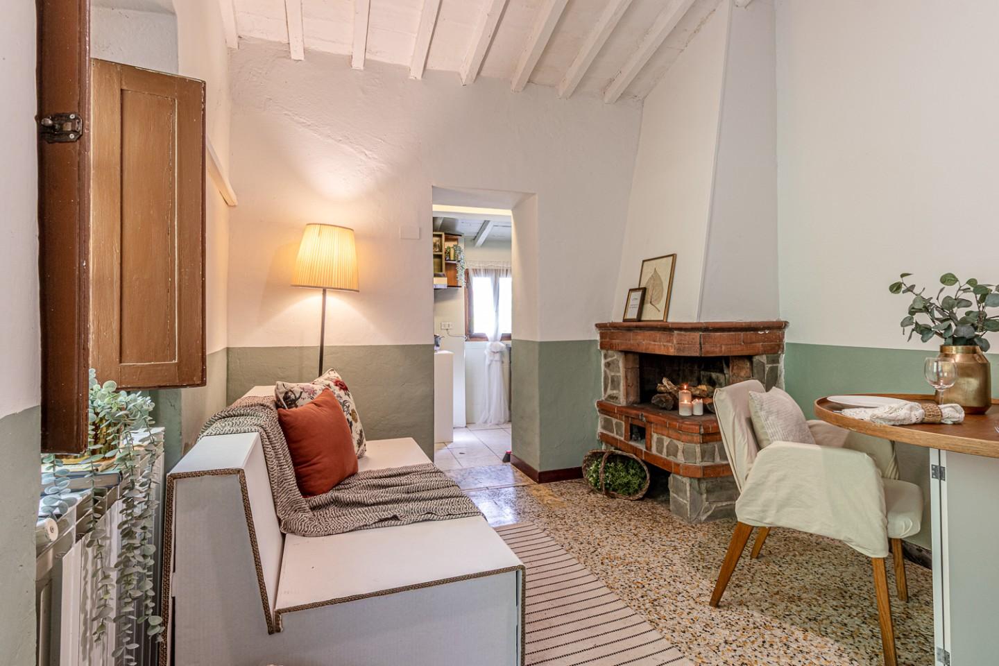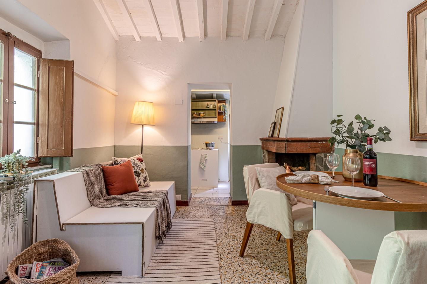 Apri la porta ed entri direttamente nella zona giorno con camino originale: il punto scenografico della stanza attorno a cui disponi il divano, la zona TV e il tavolo da pranzo. La cucina è collegata al living ma resta separata: una configurazione funzionale, utile per