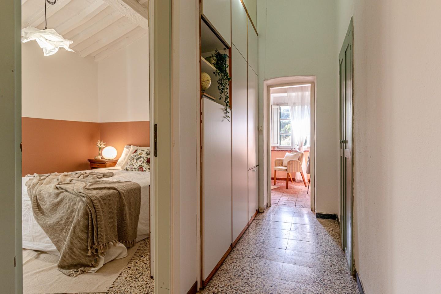Il disimpegno ti porta alla zona notte e al bagno. Qui lʼarmadiatura passante e su misura aggiunge una funzione di contenitore e di separatore tra ambienti. Le camere sono due: una matrimoniale e una singola. La singola funziona bene anche come studio o camera
