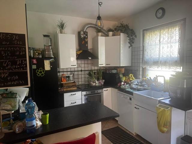 La cucina abitabile completa la zona giorno insieme al bagno di servizio e al pratico ripostiglio.