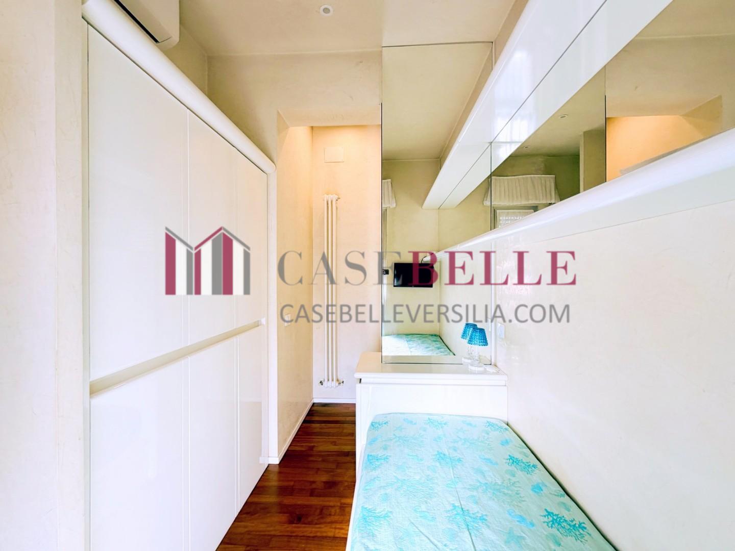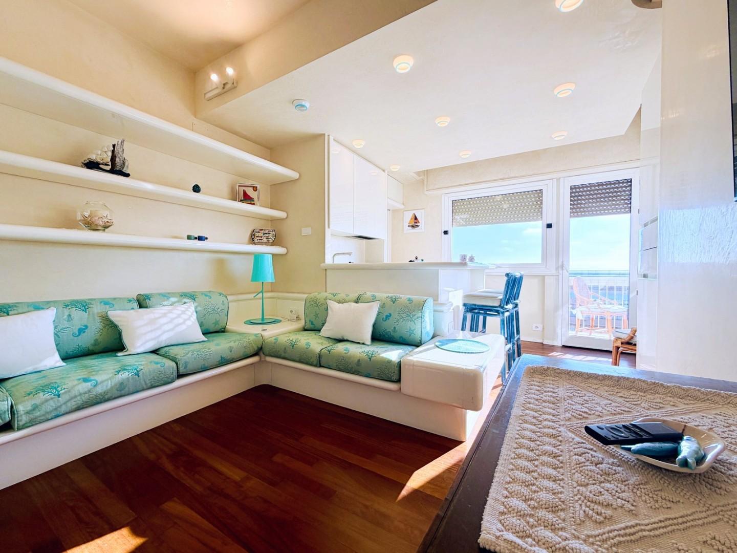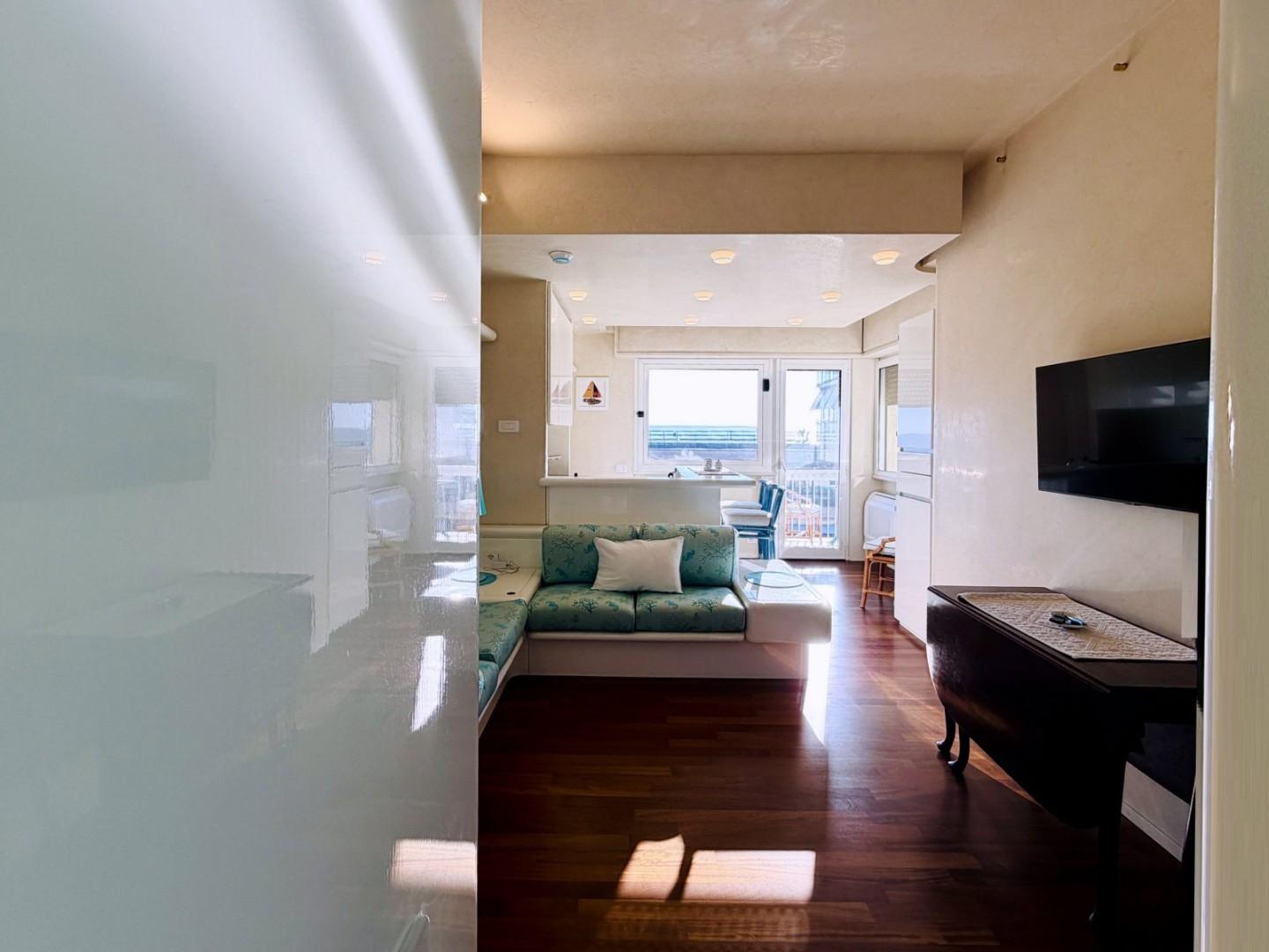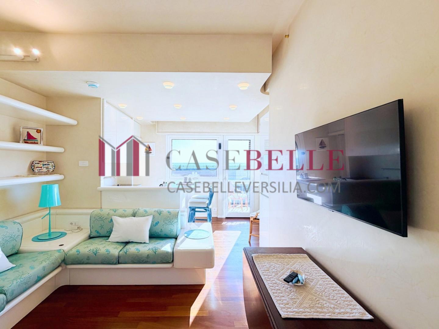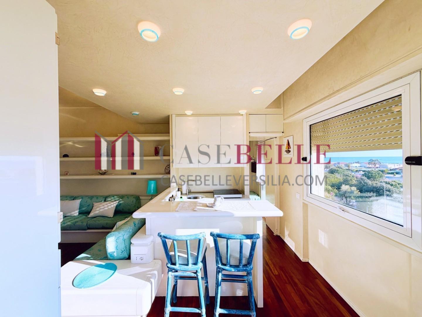 L'ingresso all'abitazione avviene direttamente nella zona giorno. La comoda superficie ospita una graziosa isola cucina con sgabelli. Il soggiorno è spazioso e servito da un pratico divano. La zona giorno di oltre 25 mq fruisce di generose aperture che regalano una pregevole vista sul mare oltre che luce ed aria alla stanza. Attraverso la porta a finestra si fuoriesce sul primo terrazzo. La zona notte si compone di una cameretta ed una camera matrimoniale. La camera matrimoniale dispone di una seconda terrazza (più grande rispetto alla prima) dalla quale si gode sia di una vista sulle Alpi Apuane che sul litorale. Il bagno a corredo è servito da doccia.