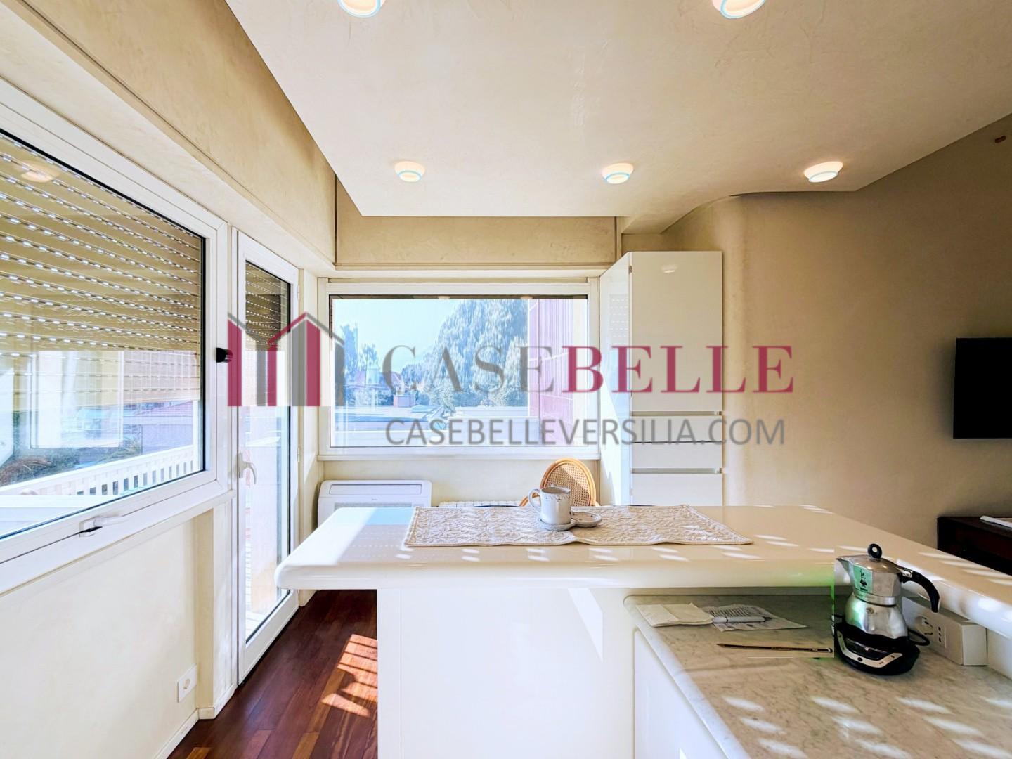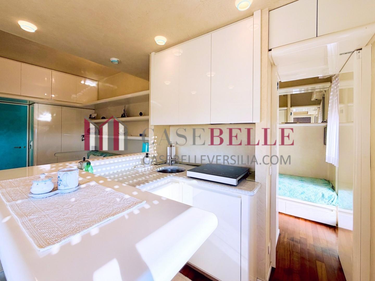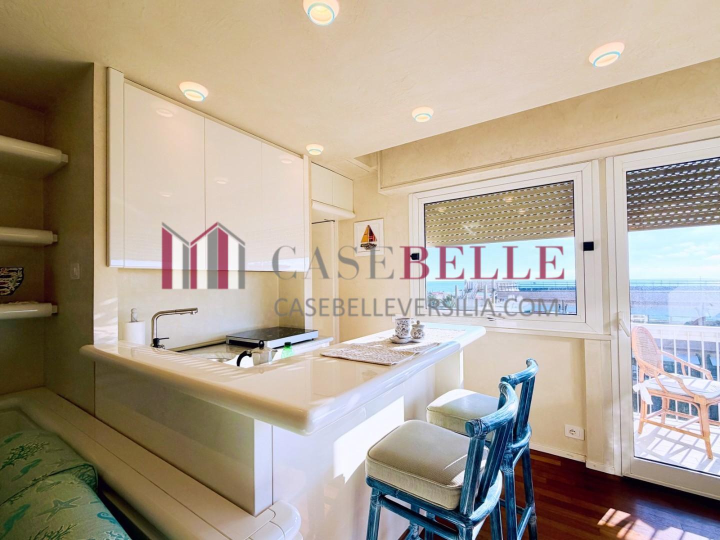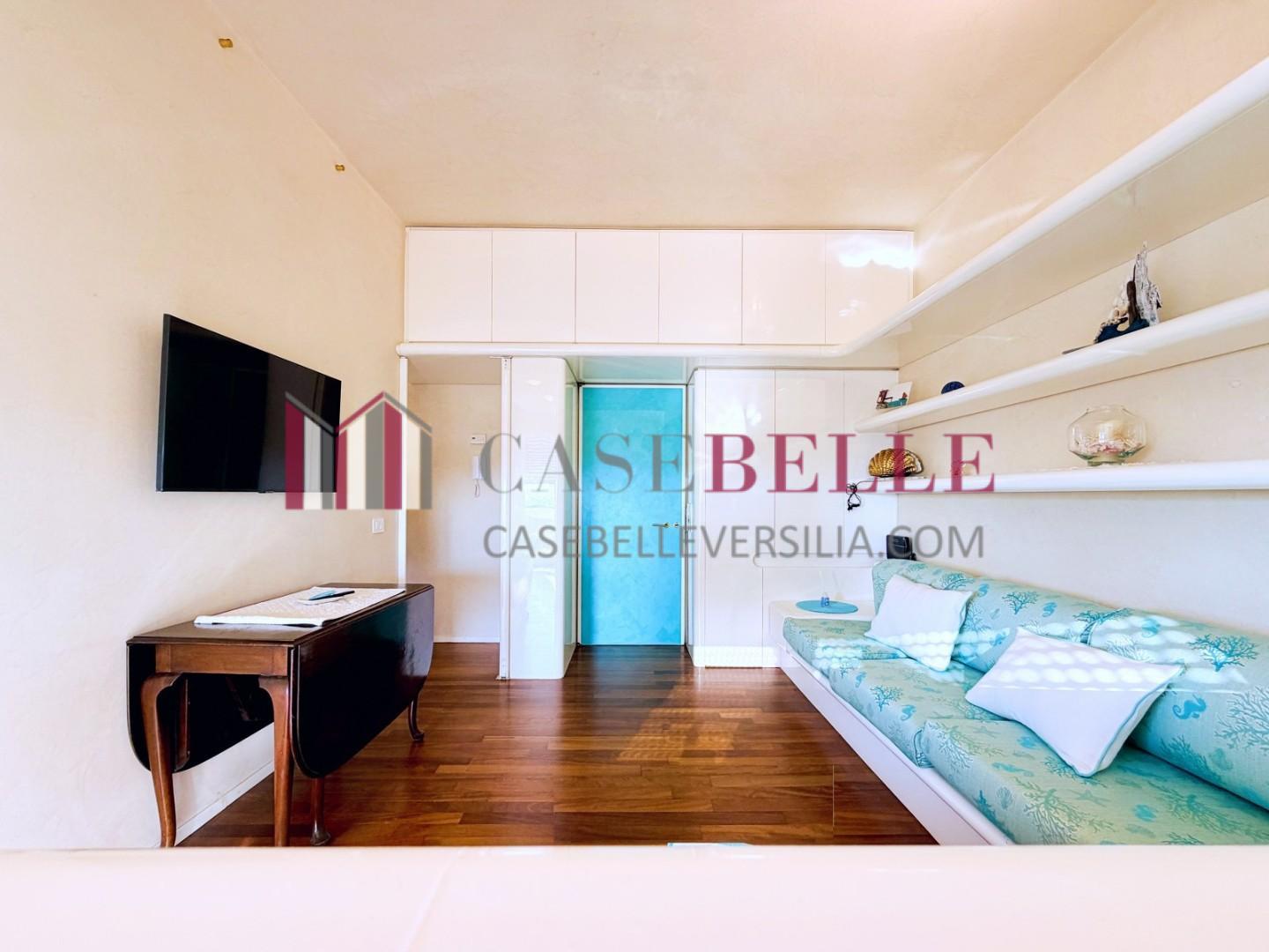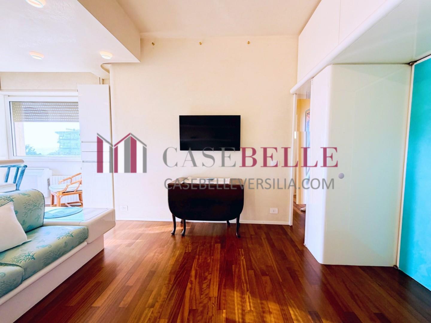 L'ingresso all'abitazione avviene direttamente nella zona giorno. La comoda superficie ospita una graziosa isola cucina con sgabelli. Il soggiorno è spazioso e servito da un pratico divano. La zona giorno di oltre 25 mq fruisce di generose aperture che regalano una pregevole vista sul mare oltre che luce ed aria alla stanza. Attraverso la porta a finestra si fuoriesce sul primo terrazzo. La zona notte si compone di una cameretta ed una camera matrimoniale. La camera matrimoniale dispone di una seconda terrazza (più grande rispetto alla prima) dalla quale si gode sia di una vista sulle Alpi Apuane che sul litorale. Il bagno a corredo è servito da doccia.