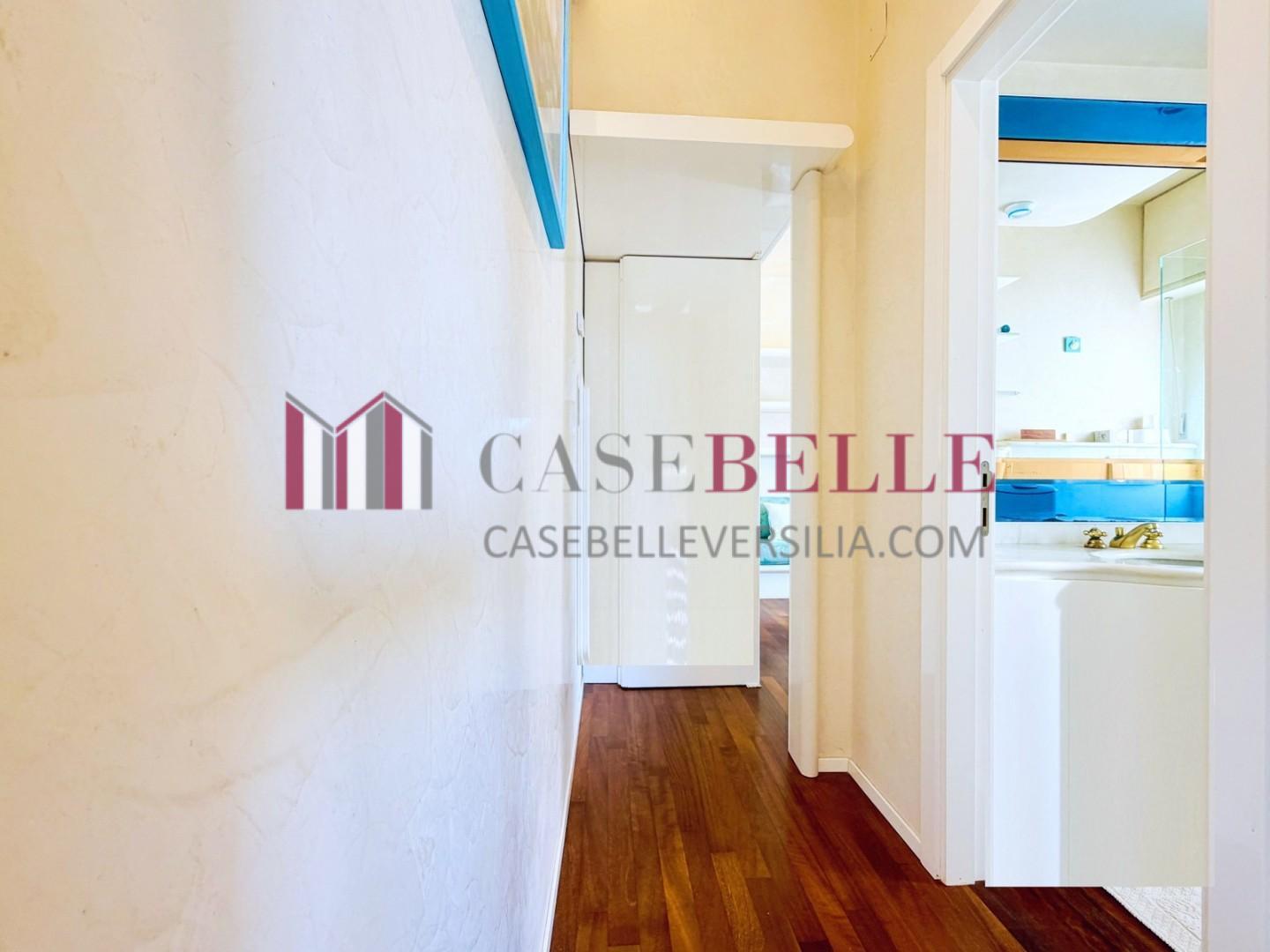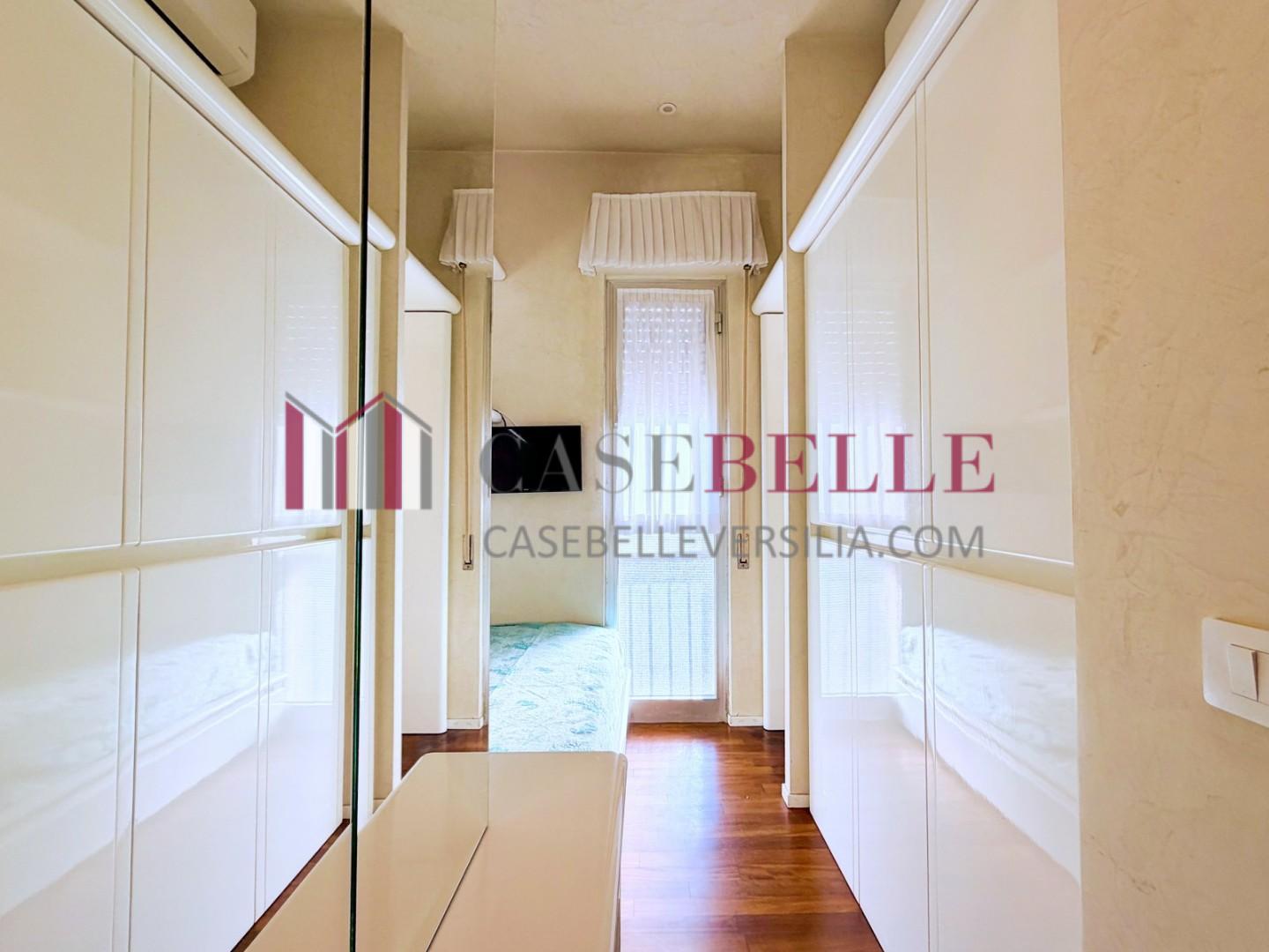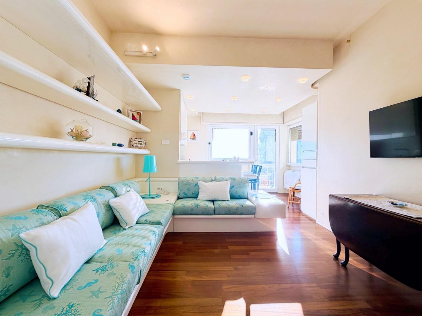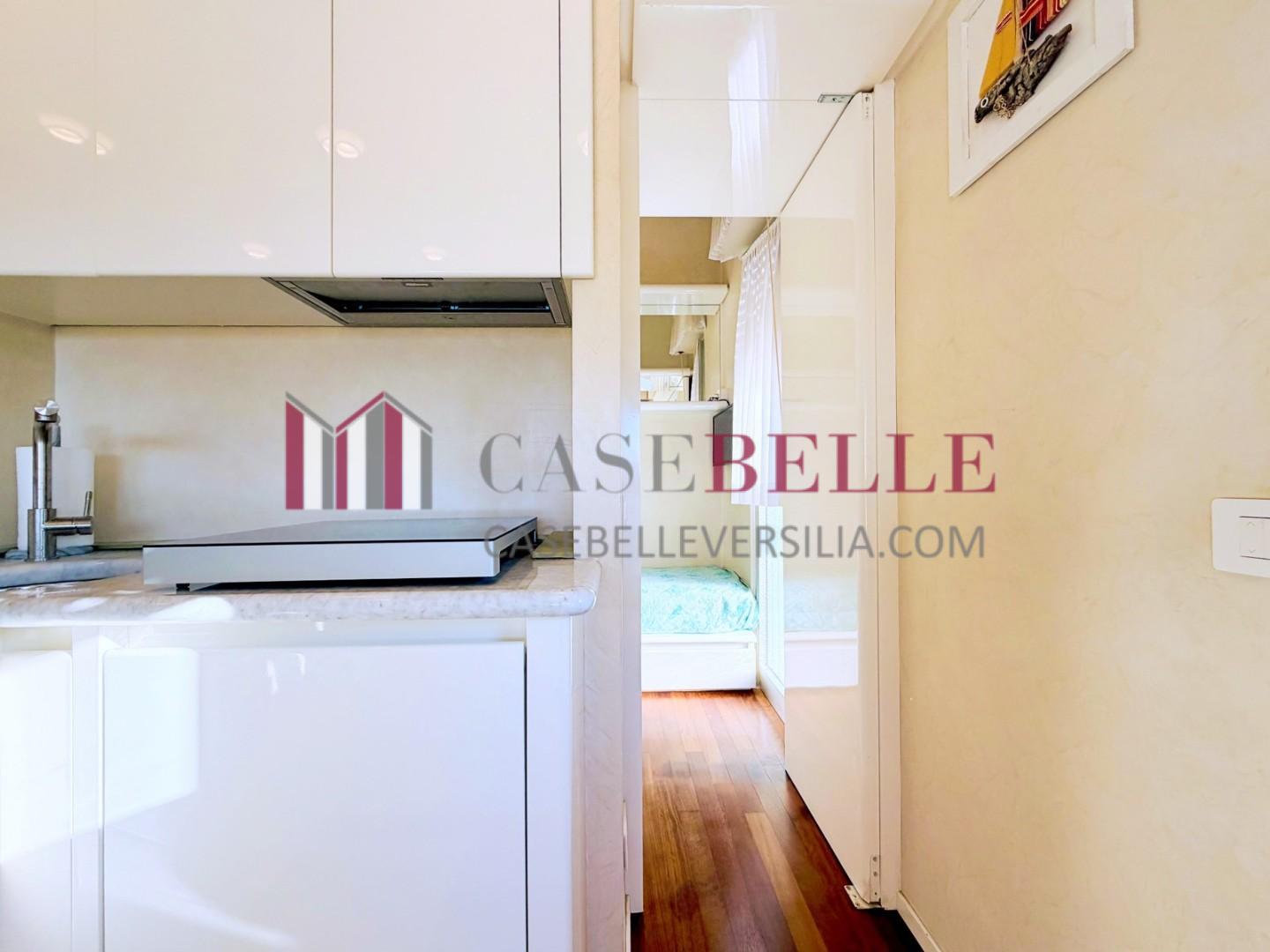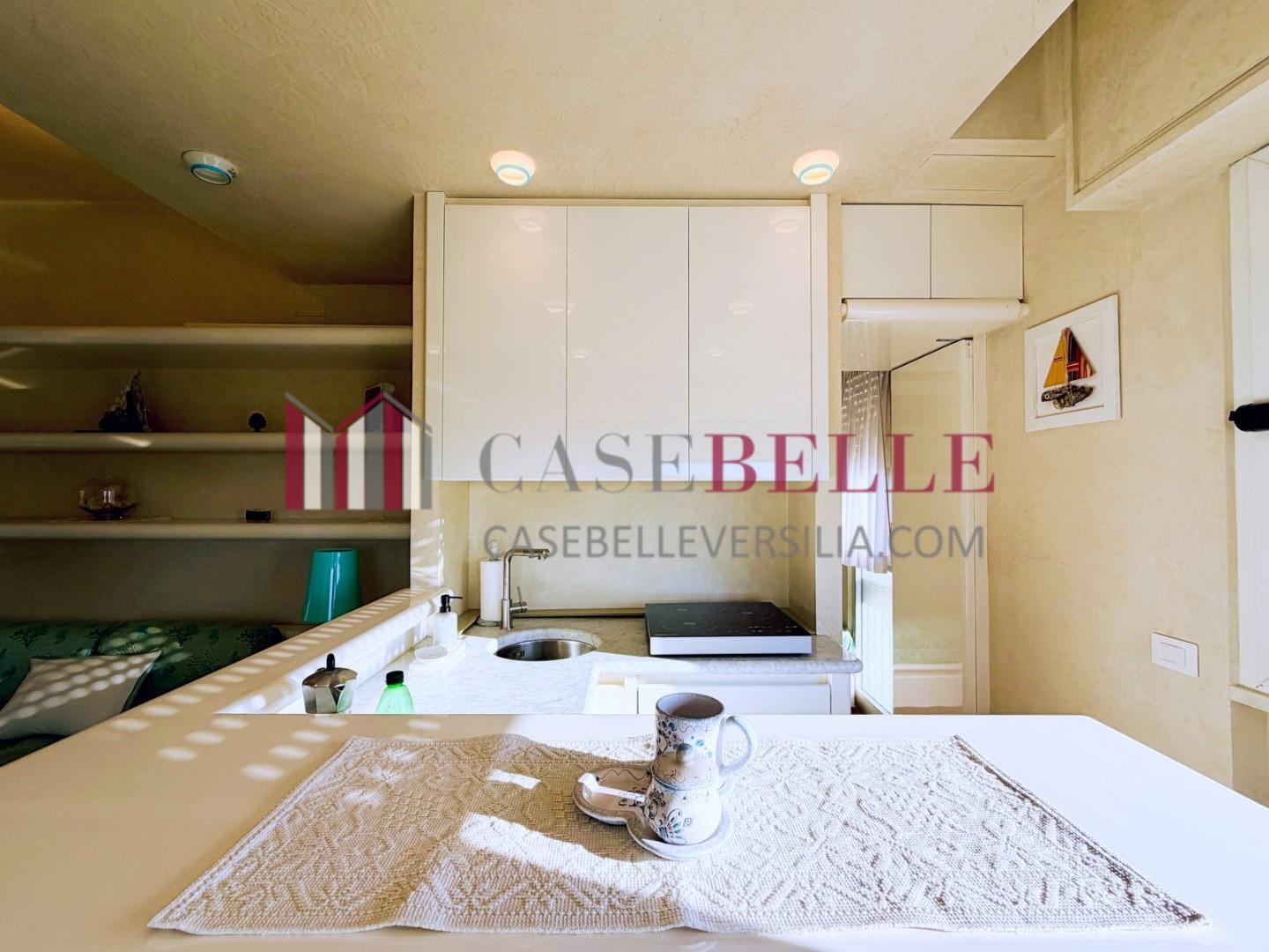 L'ingresso all'abitazione avviene direttamente nella zona giorno. La comoda superficie ospita una graziosa isola cucina con sgabelli. Il soggiorno è spazioso e servito da un pratico divano. La zona giorno di oltre 25 mq fruisce di generose aperture che regalano una pregevole vista sul mare oltre che luce ed aria alla stanza. Attraverso la porta a finestra si fuoriesce sul primo terrazzo. La zona notte si compone di una cameretta ed una camera matrimoniale. La camera matrimoniale dispone di una seconda terrazza (più grande rispetto alla prima) dalla quale si gode sia di una vista sulle Alpi Apuane che sul litorale. Il bagno a corredo è servito da doccia.