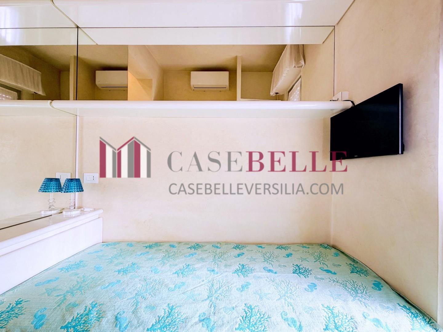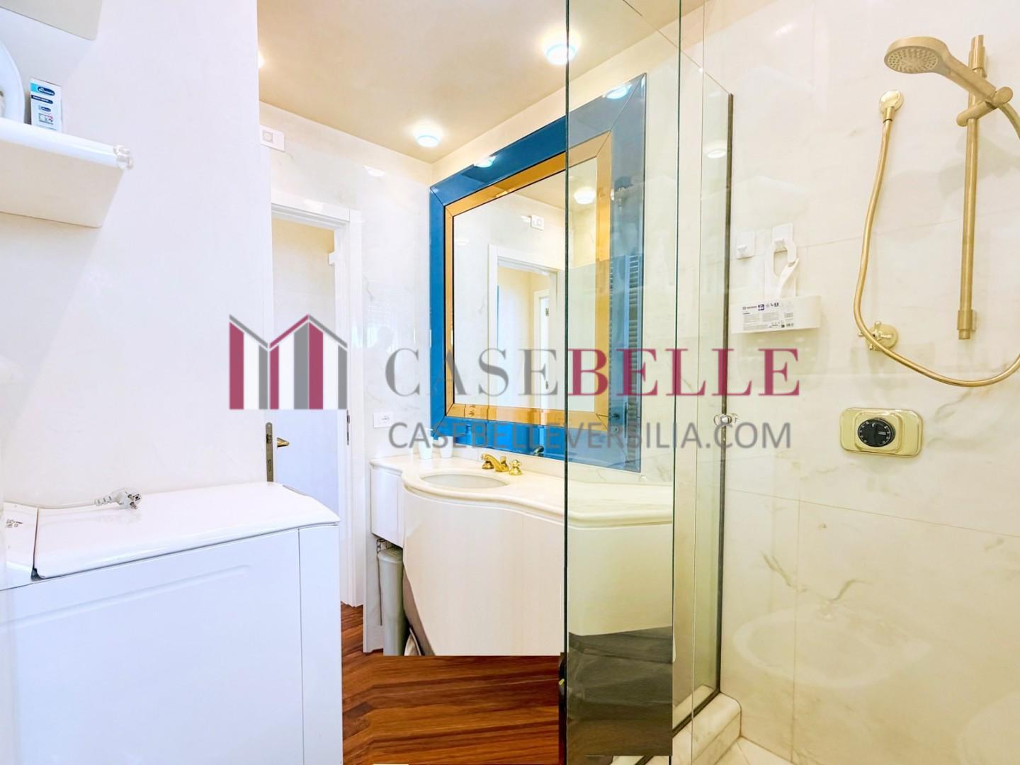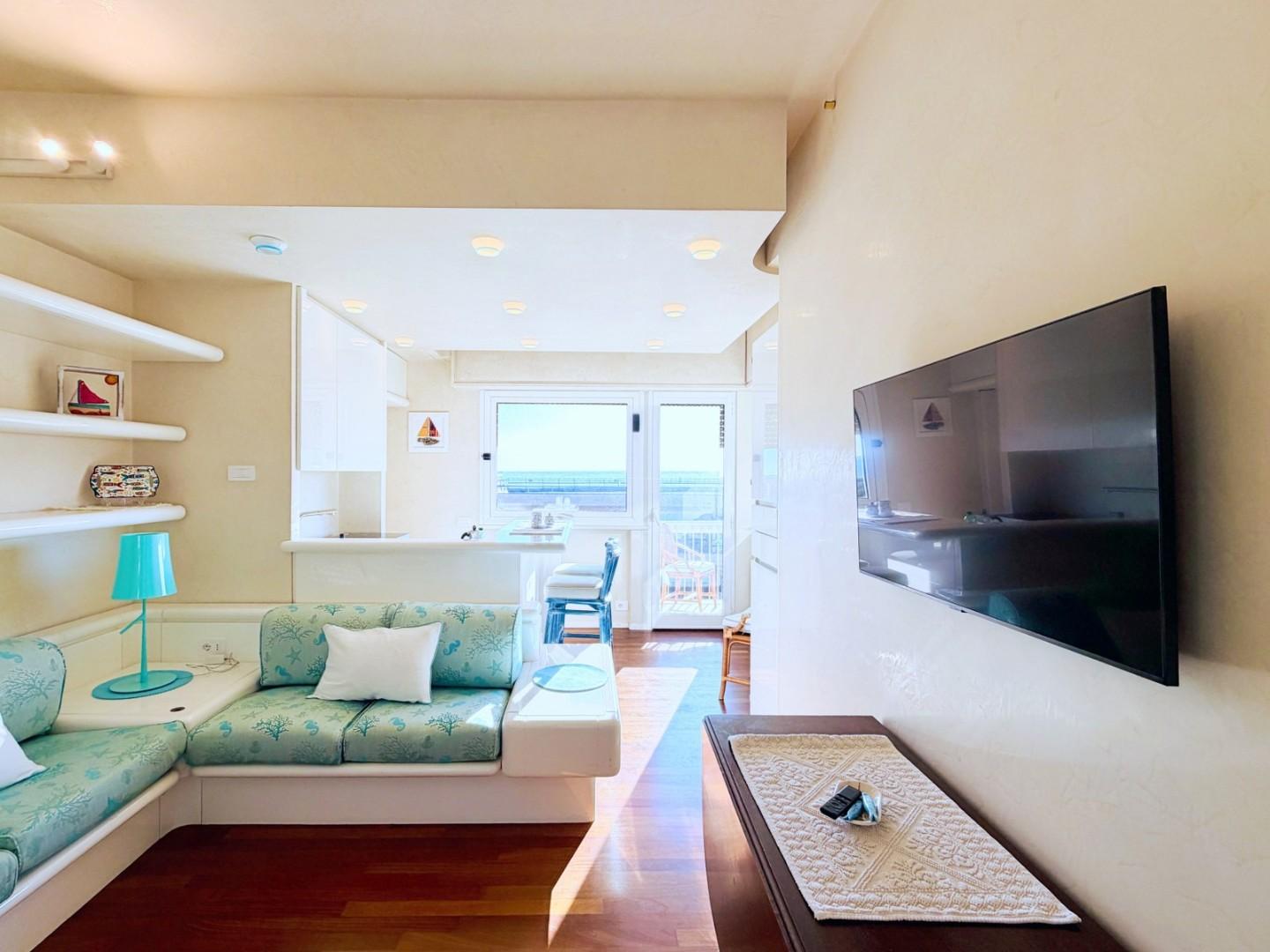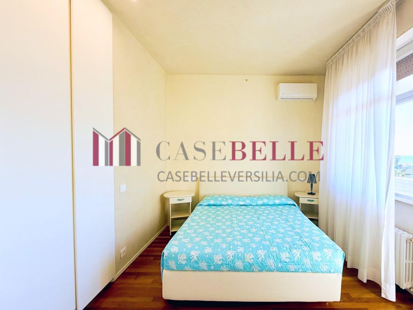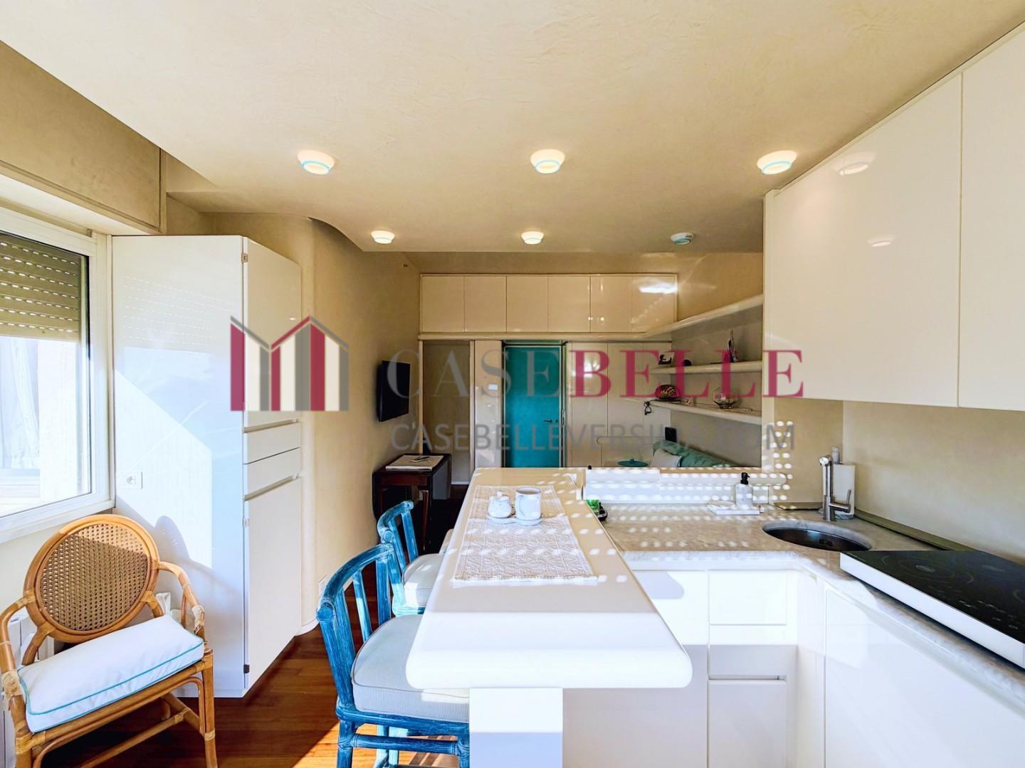 L'ingresso all'abitazione avviene direttamente nella zona giorno. La comoda superficie ospita una graziosa isola cucina con sgabelli. Il soggiorno è spazioso e servito da un pratico divano. La zona giorno di oltre 25 mq fruisce di generose aperture che regalano una pregevole vista sul mare oltre che luce ed aria alla stanza. Attraverso la porta a finestra si fuoriesce sul primo terrazzo. La zona notte si compone di una cameretta ed una camera matrimoniale. La camera matrimoniale dispone di una seconda terrazza (più grande rispetto alla prima) dalla quale si gode sia di una vista sulle Alpi Apuane che sul litorale. Il bagno a corredo è servito da doccia.