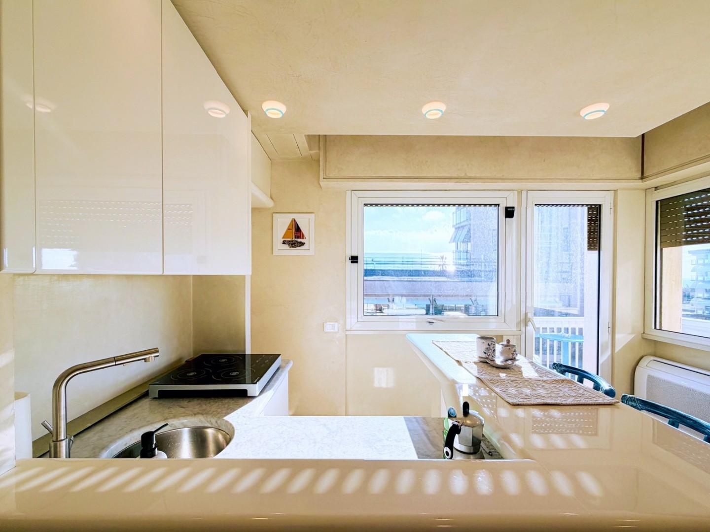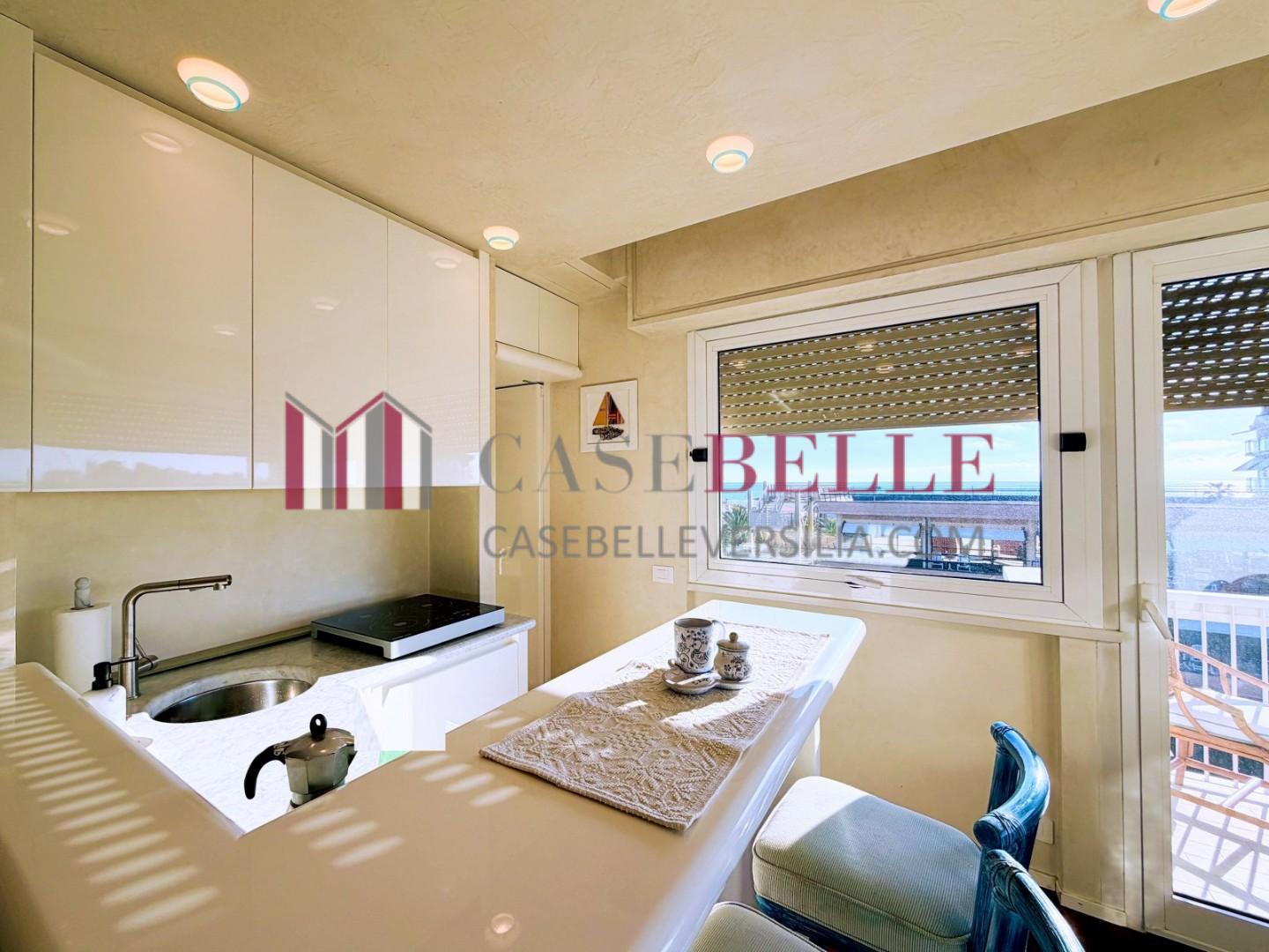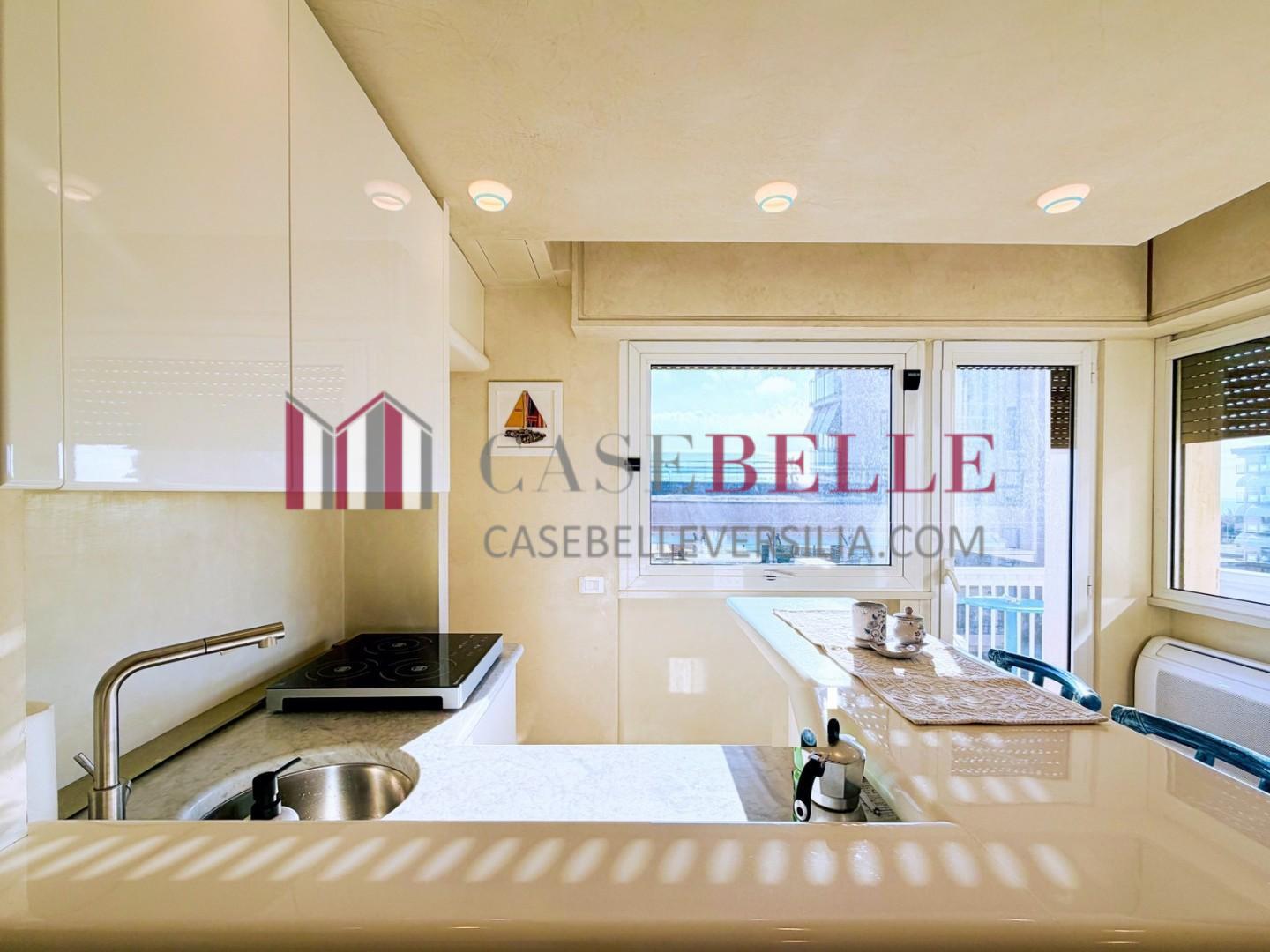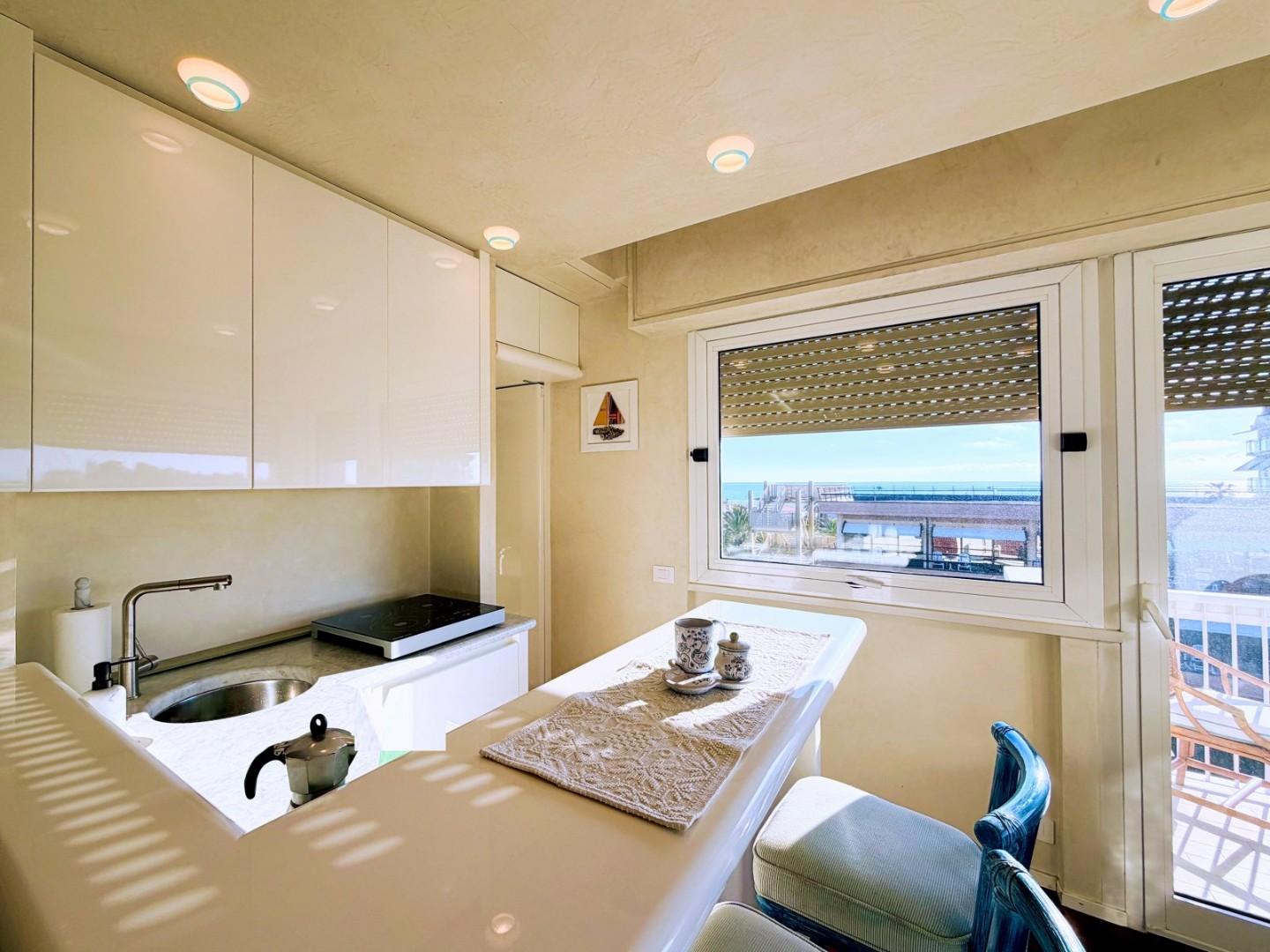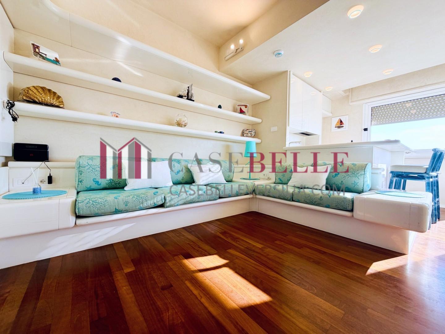 L'ingresso all'abitazione avviene direttamente nella zona giorno. La comoda superficie ospita una graziosa isola cucina con sgabelli. Il soggiorno è spazioso e servito da un pratico divano. La zona giorno di oltre 25 mq fruisce di generose aperture che regalano una pregevole vista sul mare oltre che luce ed aria alla stanza. Attraverso la porta a finestra si fuoriesce sul primo terrazzo. La zona notte si compone di una cameretta ed una camera matrimoniale. La camera matrimoniale dispone di una seconda terrazza (più grande rispetto alla prima) dalla quale si gode sia di una vista sulle Alpi Apuane che sul litorale. Il bagno a corredo è servito da doccia.