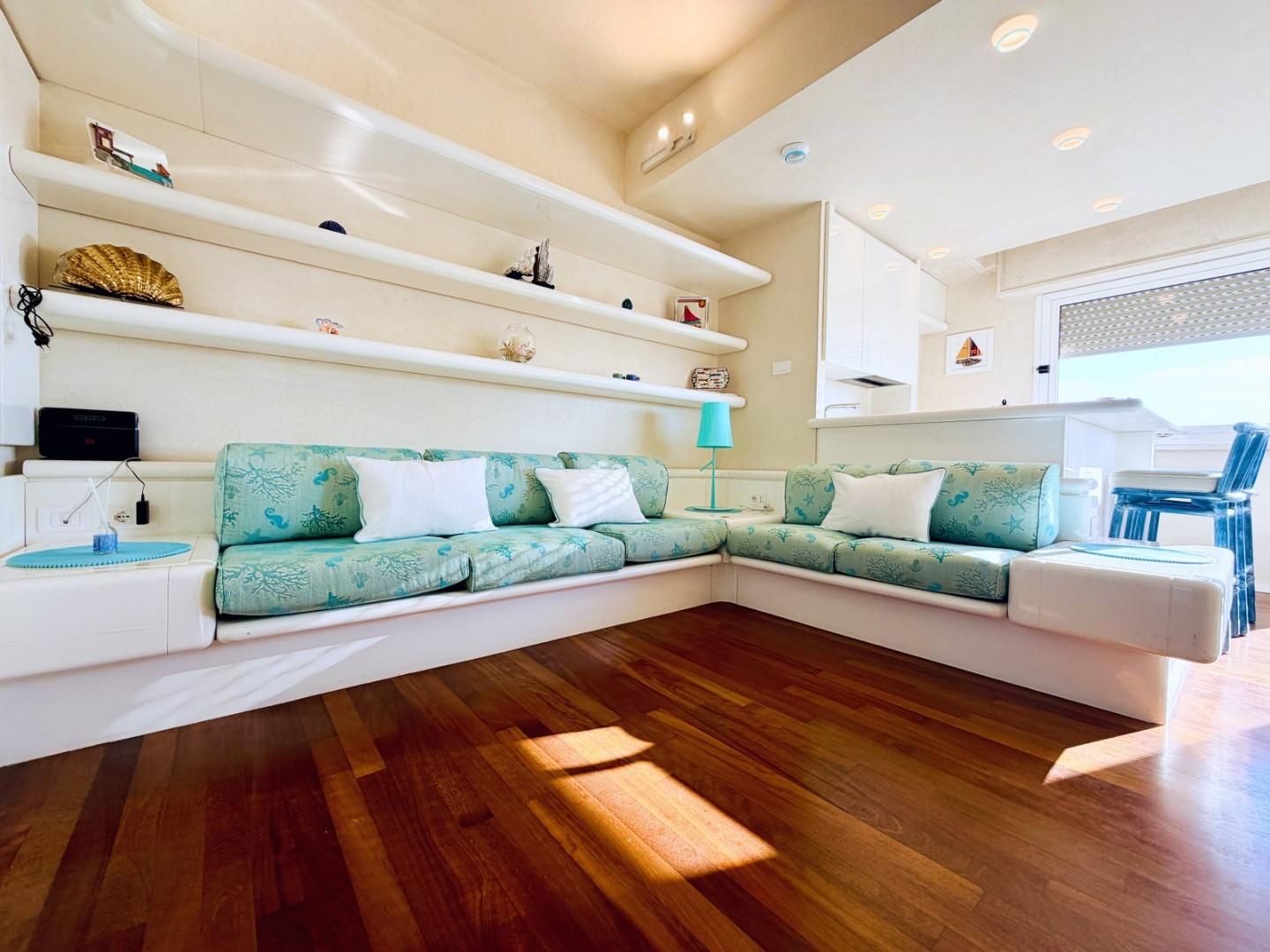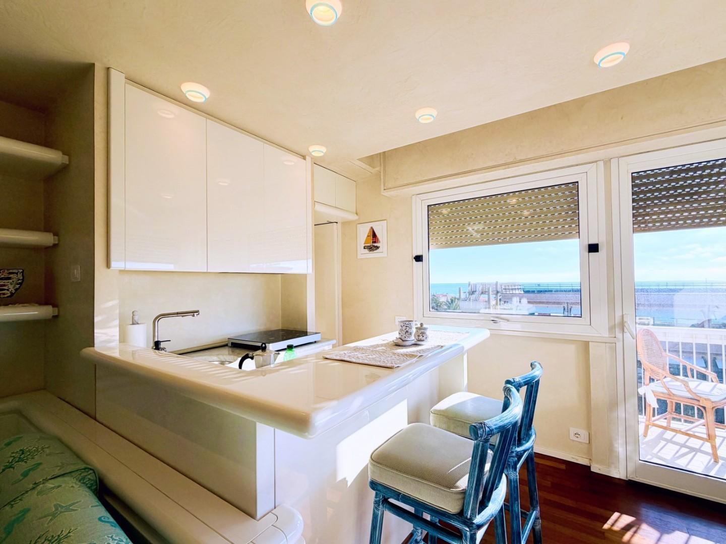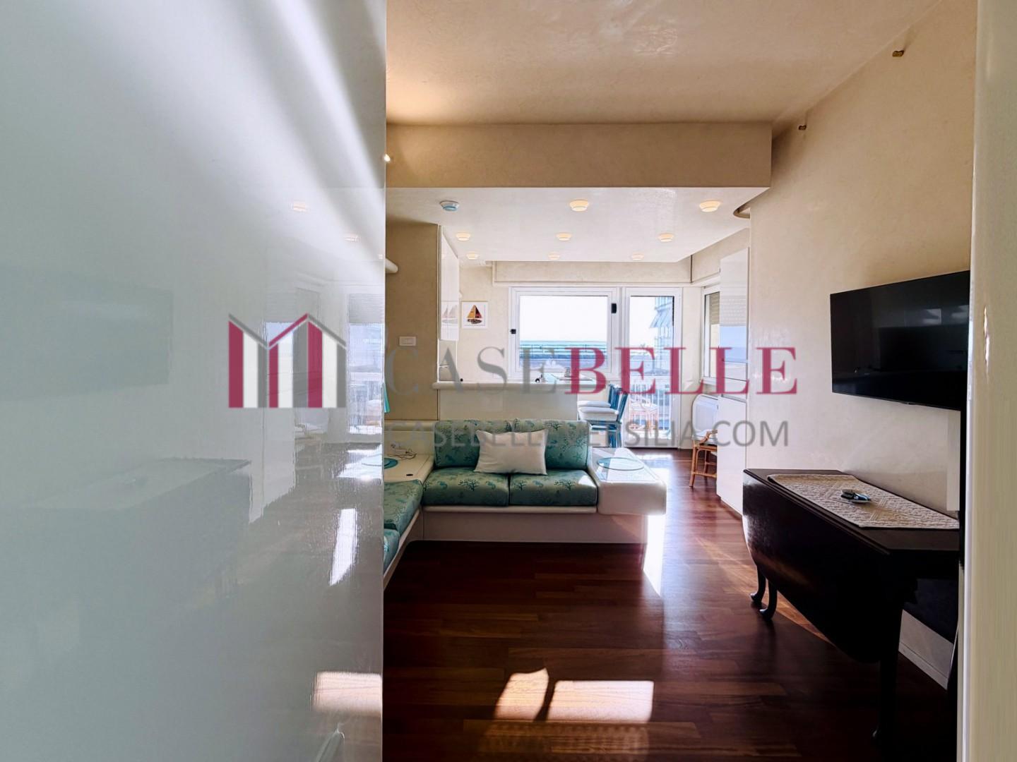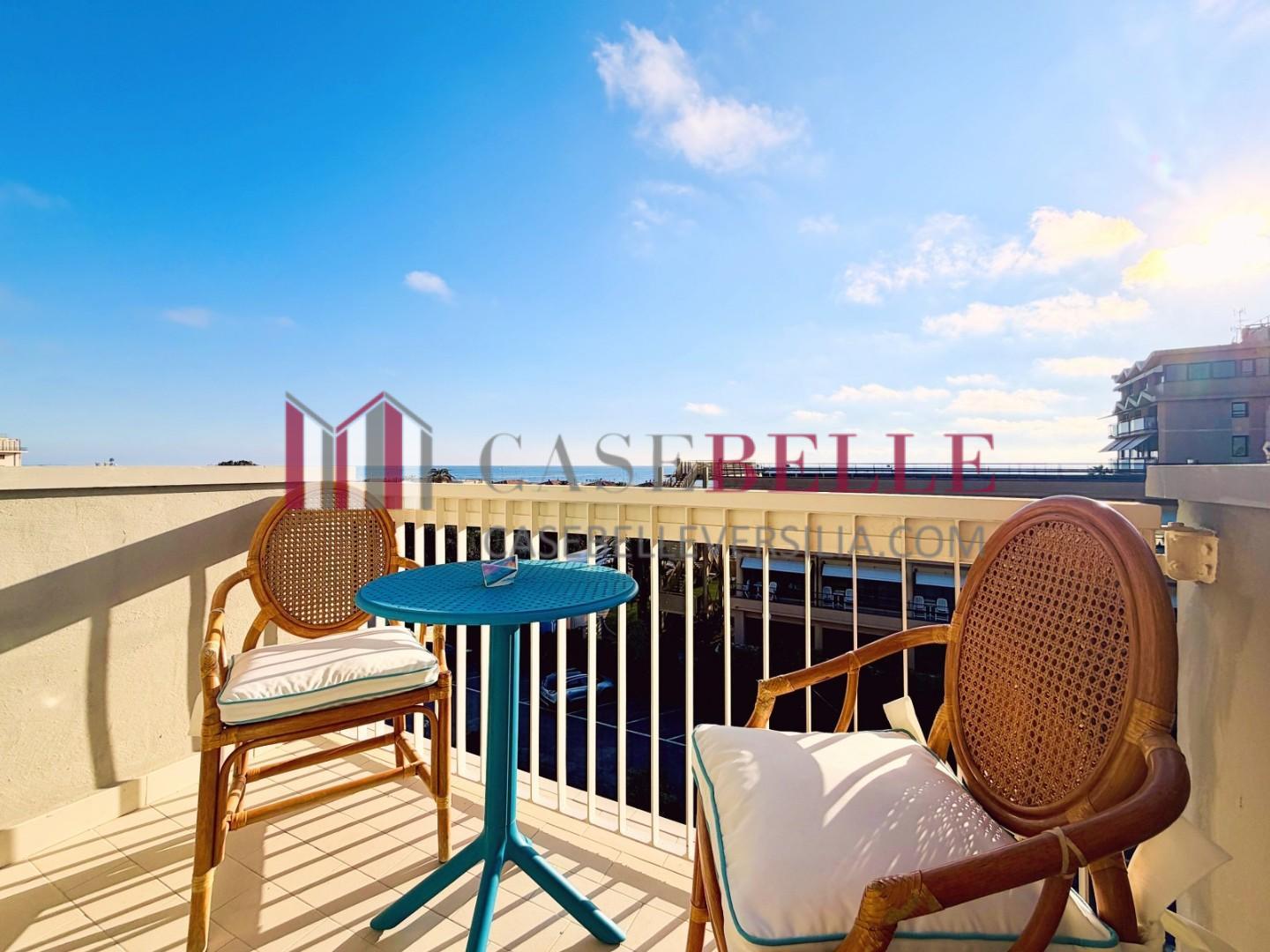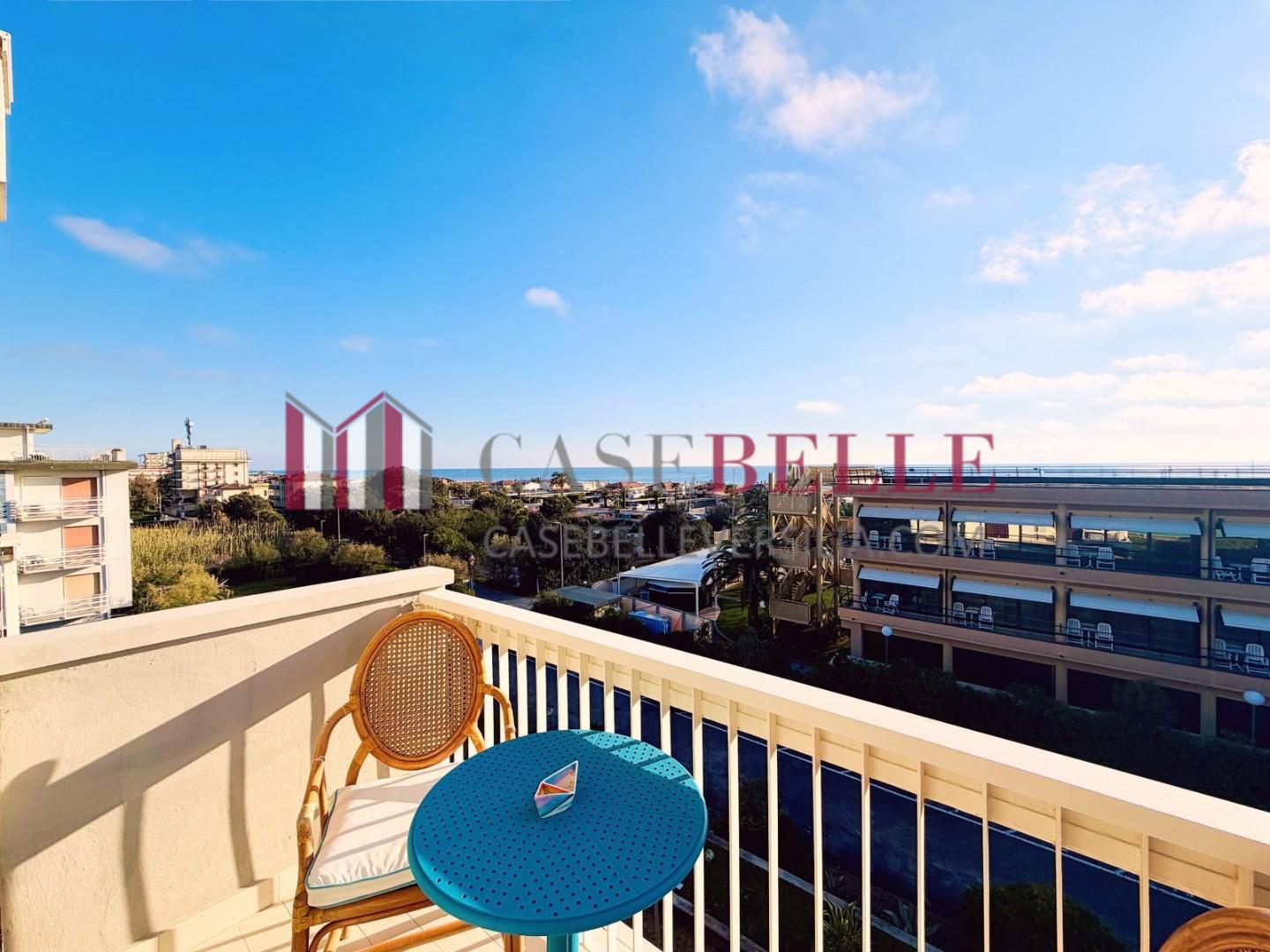 L'ingresso all'abitazione avviene direttamente nella zona giorno. La comoda superficie ospita una graziosa isola cucina con sgabelli. Il soggiorno è spazioso e servito da un pratico divano. La zona giorno di oltre 25 mq fruisce di generose aperture che regalano una pregevole vista sul mare oltre che luce ed aria alla stanza. Attraverso la porta a finestra si fuoriesce sul primo terrazzo. La zona notte si compone di una cameretta ed una camera matrimoniale. La camera matrimoniale dispone di una seconda terrazza (più grande rispetto alla prima) dalla quale si gode sia di una vista sulle Alpi Apuane che sul litorale. Il bagno a corredo è servito da doccia.
