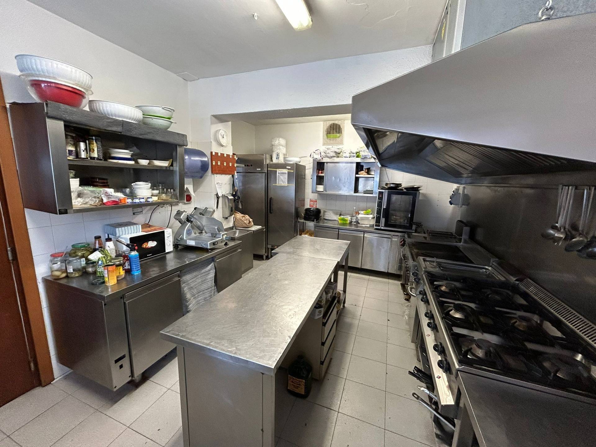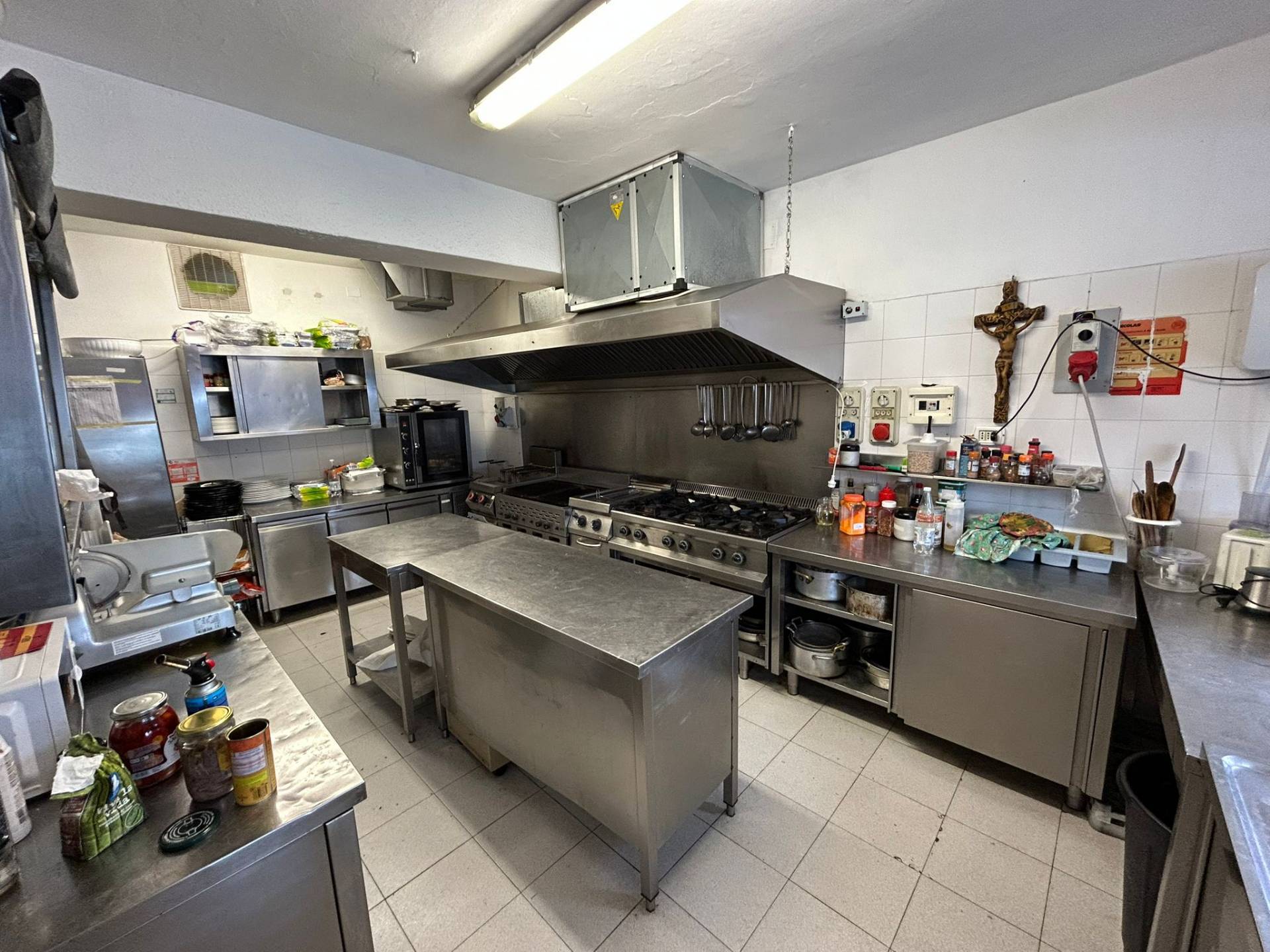 Cucina professionale completa, spaziosa e ben organizzata, dotata di: linea cottura completa, cappa aspirante professionale, piani di lavoro in acciaio e attrezzature operative già installate.