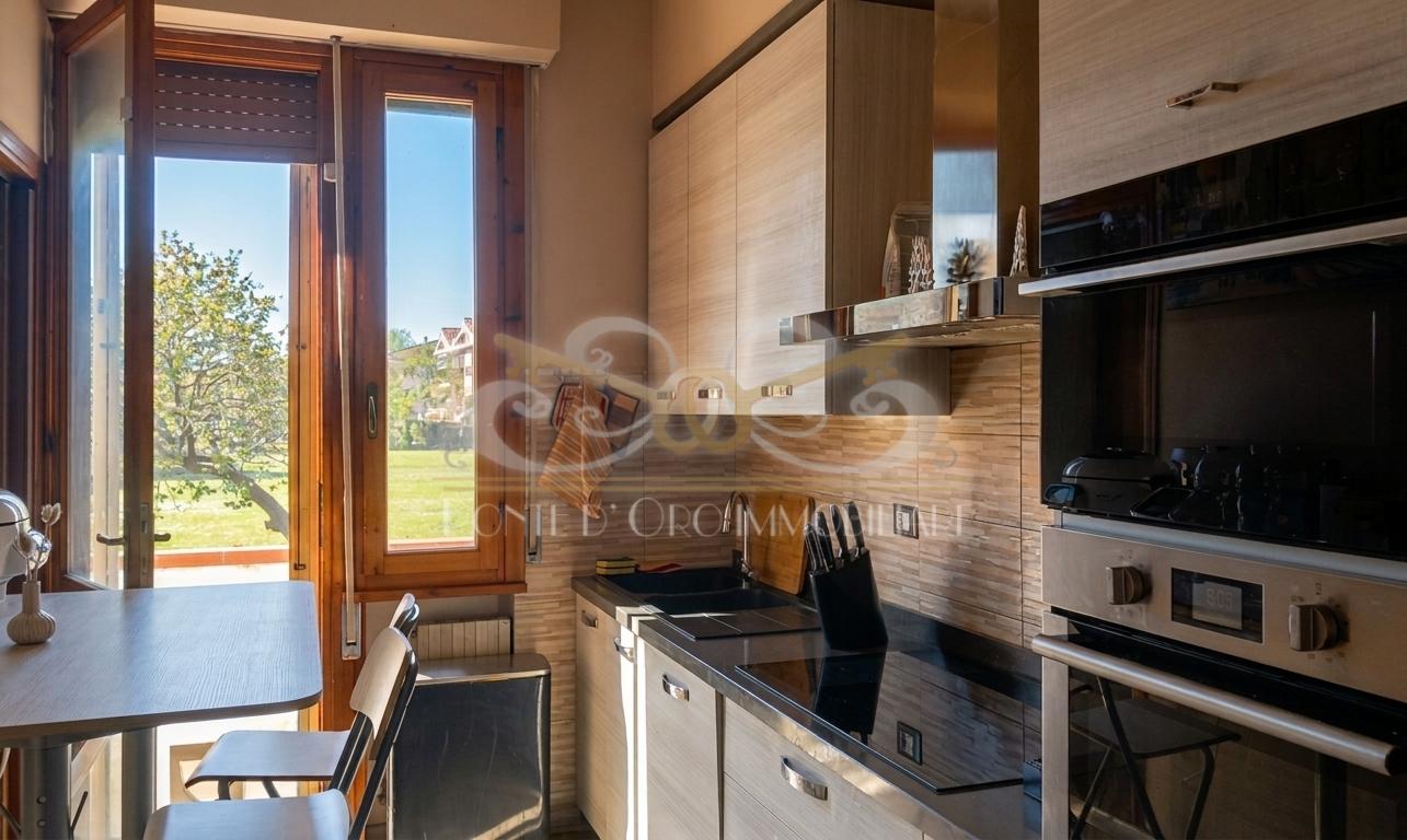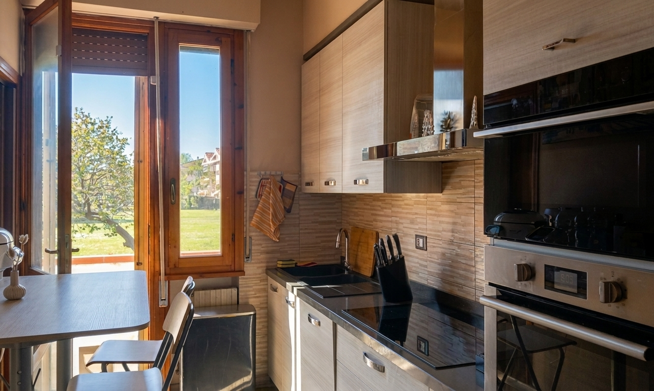 Dalla cucina si accede direttamente al piacevole giardino privato di circa 100 mq, uno spazio riservato che garantisce privacy e vivibilità all’aperto.