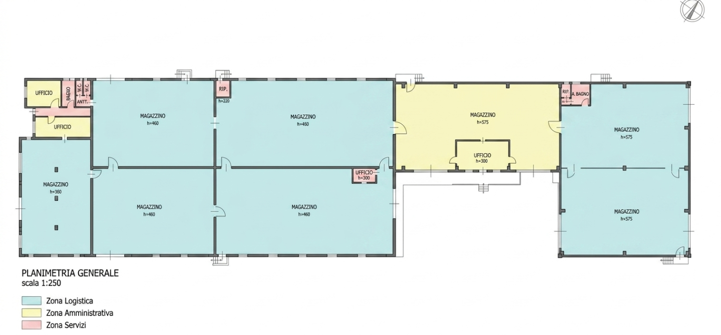 E' distribuito attualmente in diversi vani di generose dimensioni ma è possibile rendere lo stesso un unico ambiente - Le altezze interne variano; alcuni ambienti hanno invece un’altezza interna di mt 4,50 e altre sotto trave di mt. 5,75 - a corredo sempre all'interno del capannone troviamo 4 locali ad uso ufficio ( altezza interna mt 3.00) dotati di riscalamento con caldaia a gpl e raffreddamento tramite split a parte - una sala mostra e tre servizi igienici con relativo antibagno -