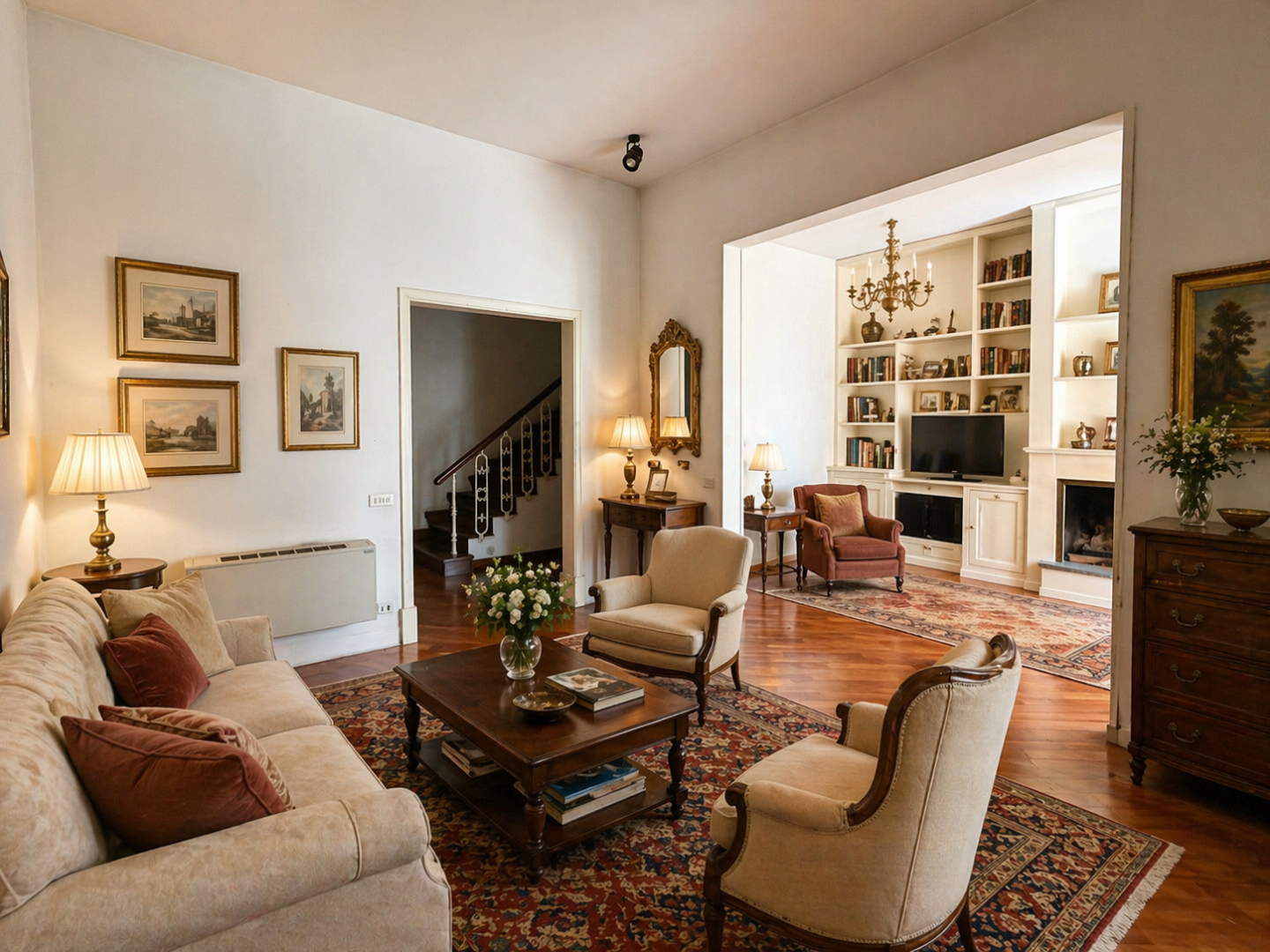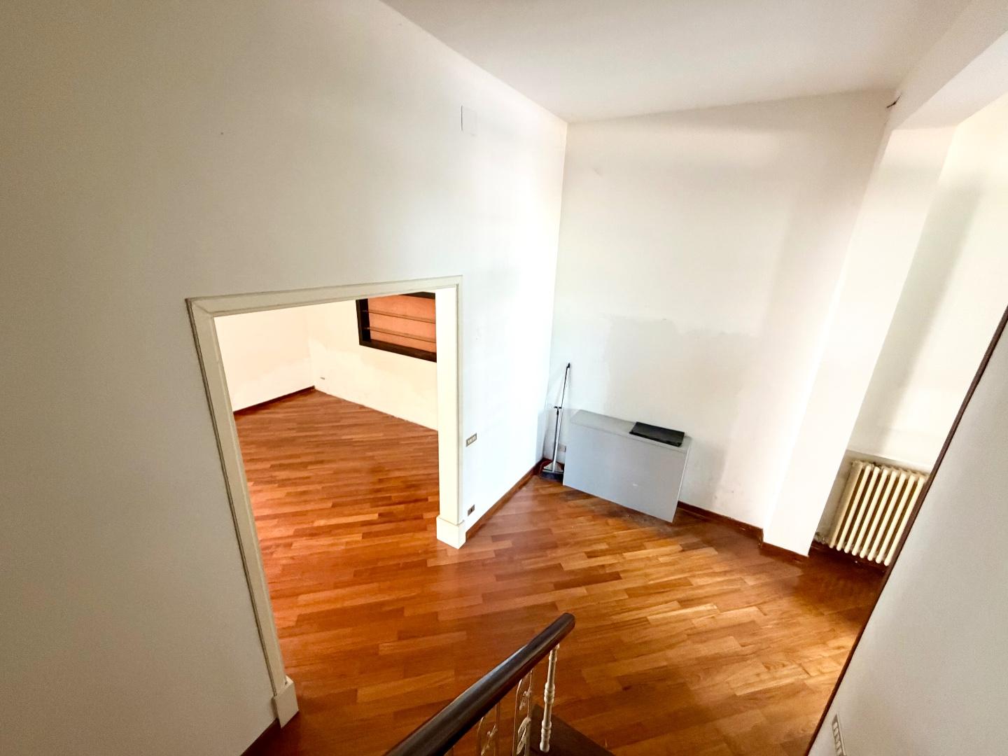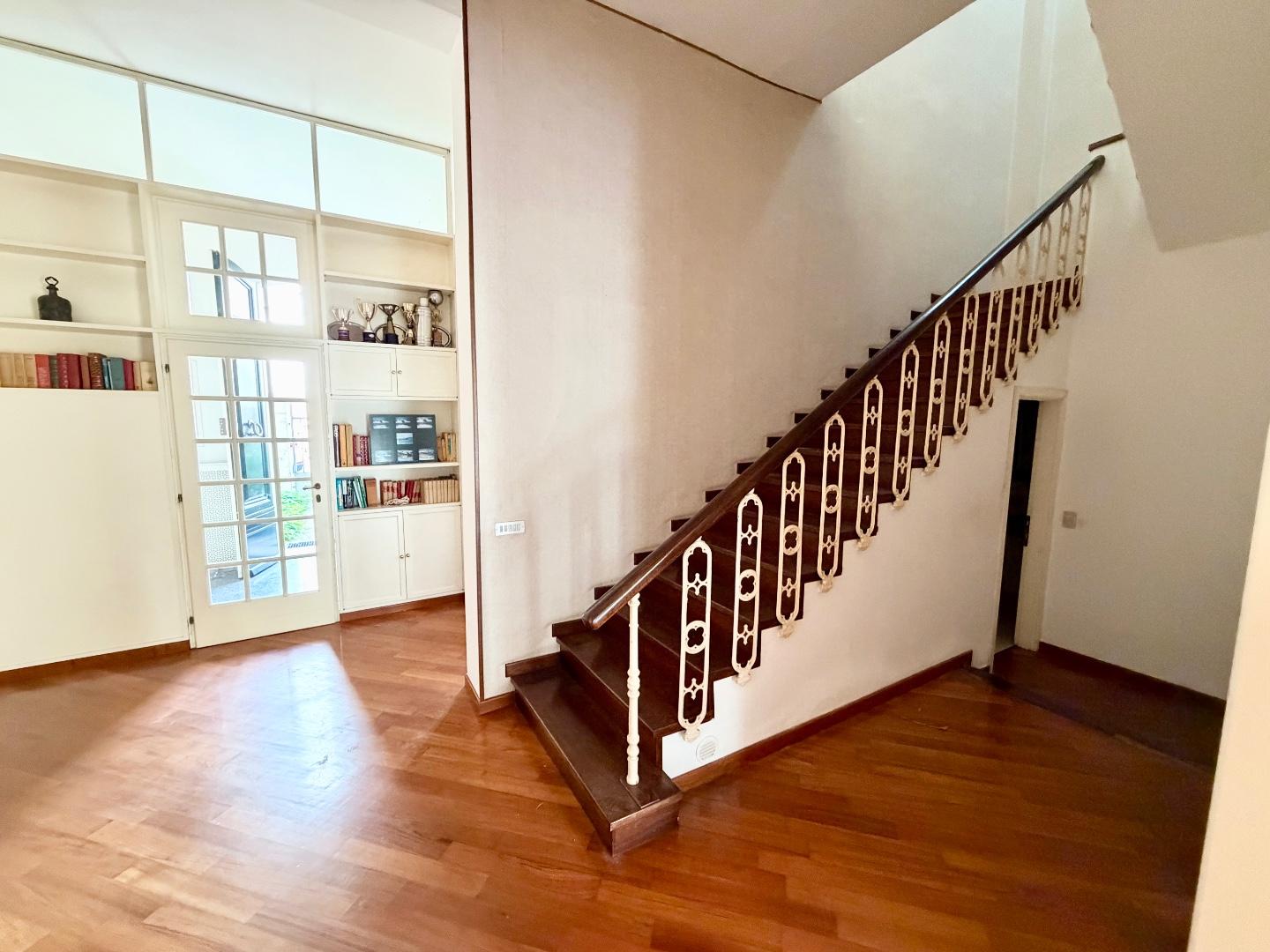 Il piano superiore, raggiungibile tramite una elegante scala in legno, ospita la zona notte composta da un ampio disimpegno, una camera padronale con cabina armadio e bagno privato dotato sia di vasca che di doccia, oltre a due ulteriori camere matrimoniali e un secondo bagno.