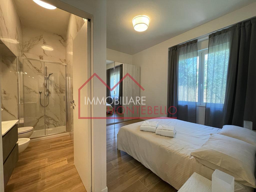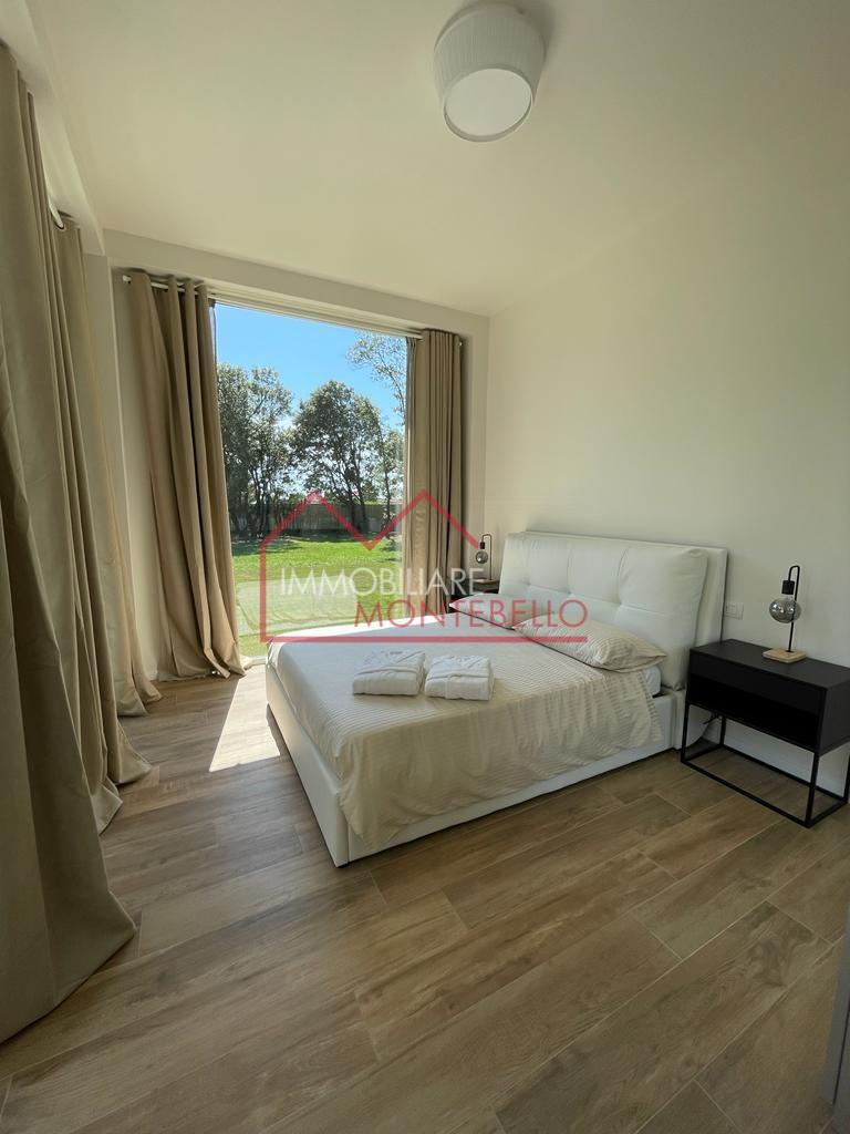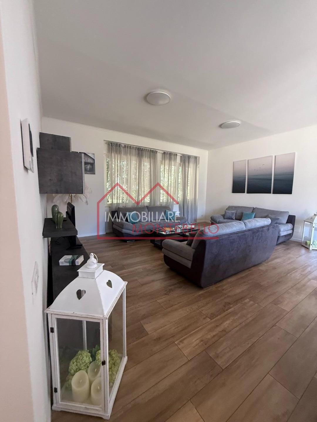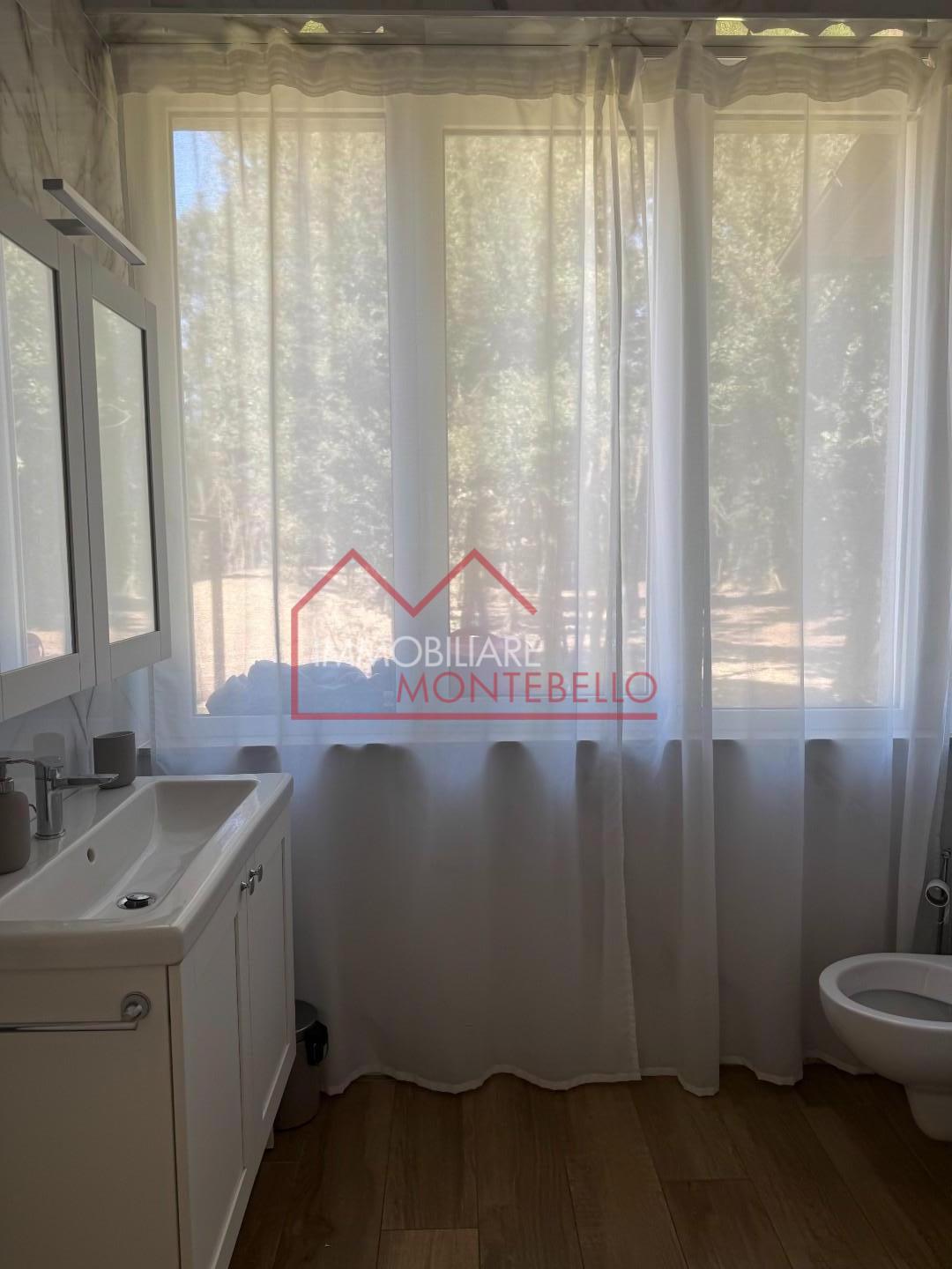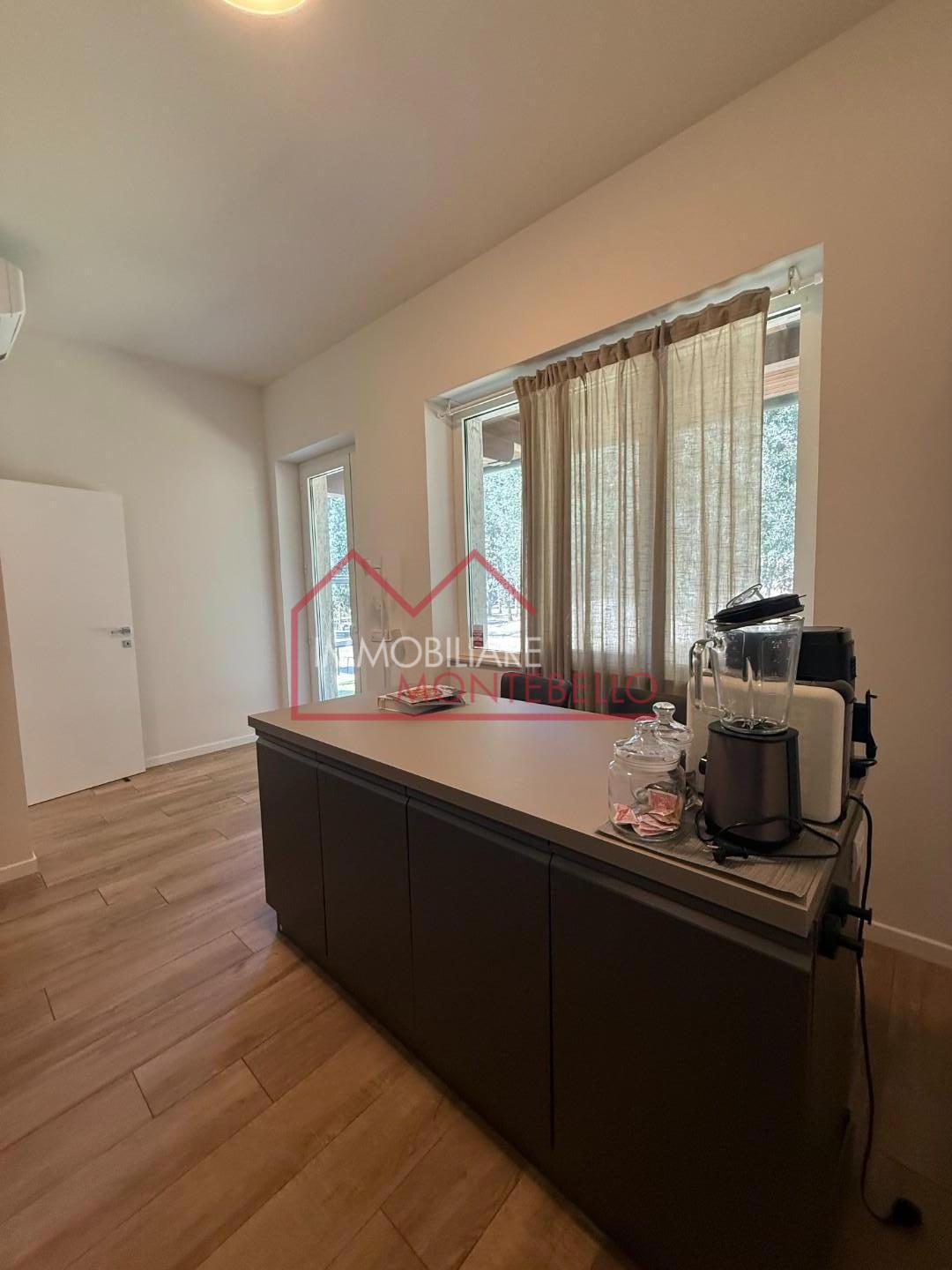 L’abitazione si apre su un ampio e luminosissimo soggiorno, impreziosito da grandi vetrate che creano una continuità visiva con l’esterno e valorizzano la luce naturale. La zona giorno è completata da una cucina abitabile.