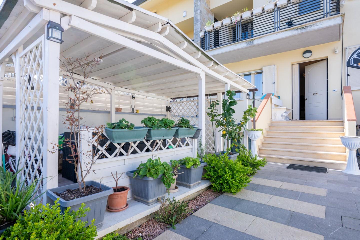 • Piano Terra: Ingresso in luminoso open-space con cucina-soggiorno, bagno finestrato con vasca e accesso al giardino privato, ideale per cene all'aperto.