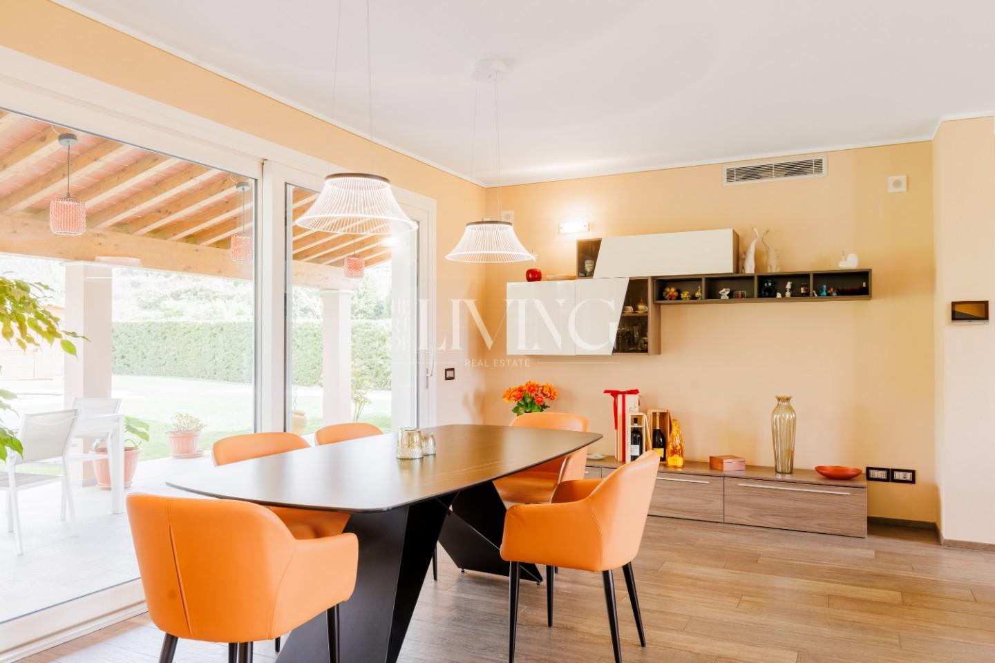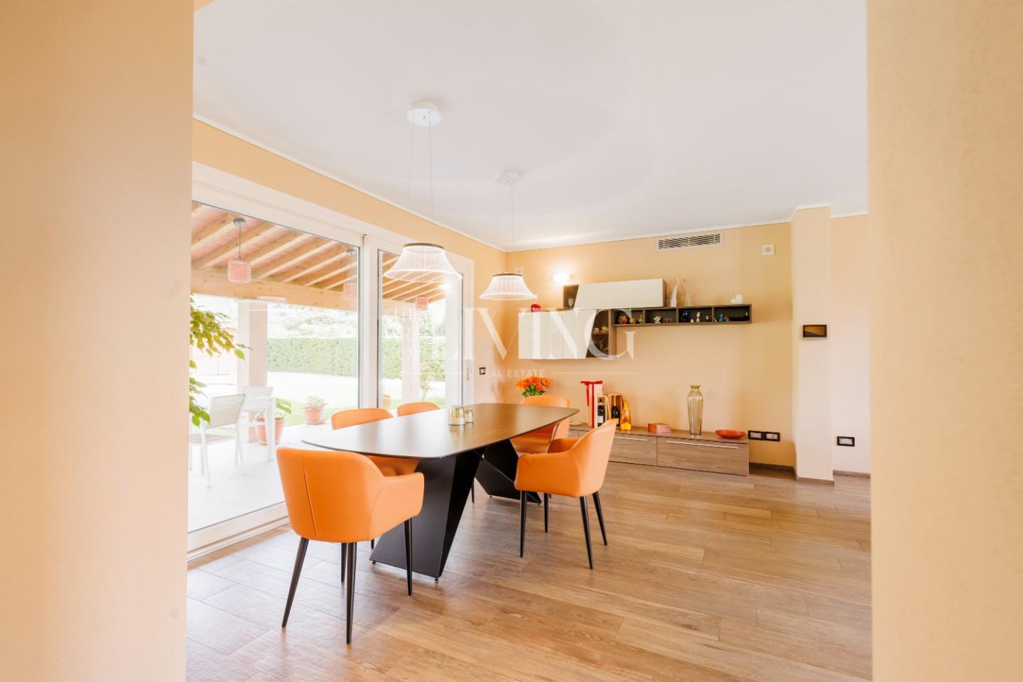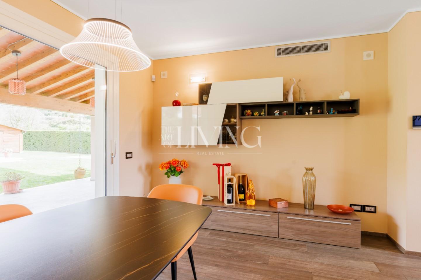 L’abitazione, costruita circa sette anni fa, si presenta in condizioni impeccabili ed è stata progettata per offrire un’esperienza abitativa moderna e senza compromessi. Gli ambienti interni sono accoglienti, luminosi e ben distribuiti. Al piano terra, il cuore della casa è rappresentato da un ampio living open space con zona pranzo e camino a legna, uno spazio che invita naturalmente alla condivisione e al relax quotidiano. La cucina, funzionale e ben integrata, dialoga perfettamente con la zona giorno, mentre un bagno di servizio e un comodo ripostiglio completano il livello.