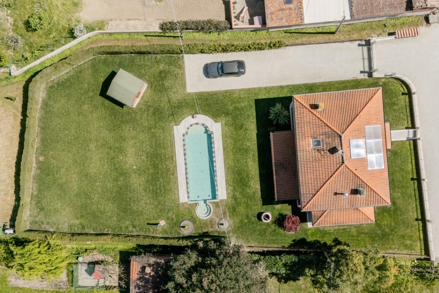 Fin dal primo ingresso si percepisce una sensazione di equilibrio e riservatezza. La villa è infatti circondata da circa 2.000 mq di giardino privato, uno spazio curato e ben organizzato che regala scorci sempre diversi e un’idea concreta di libertà. La zona più vicina alla casa è pensata per il relax e la convivialità: qui troviamo una suggestiva piscina a sfioro ad acqua salata con vasca idromassaggio integrata, perfettamente inserita nel contesto naturale. Poco distante, il portico coperto diventa il luogo ideale per vivere l’esterno in ogni stagione, tra cene con amici, momenti in famiglia e serate d’estate dal sapore tipicamente toscano.