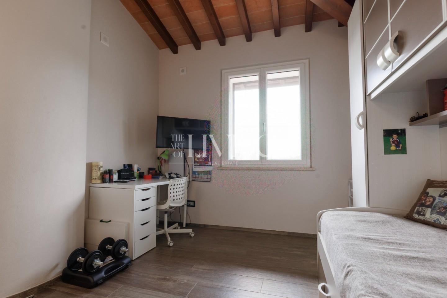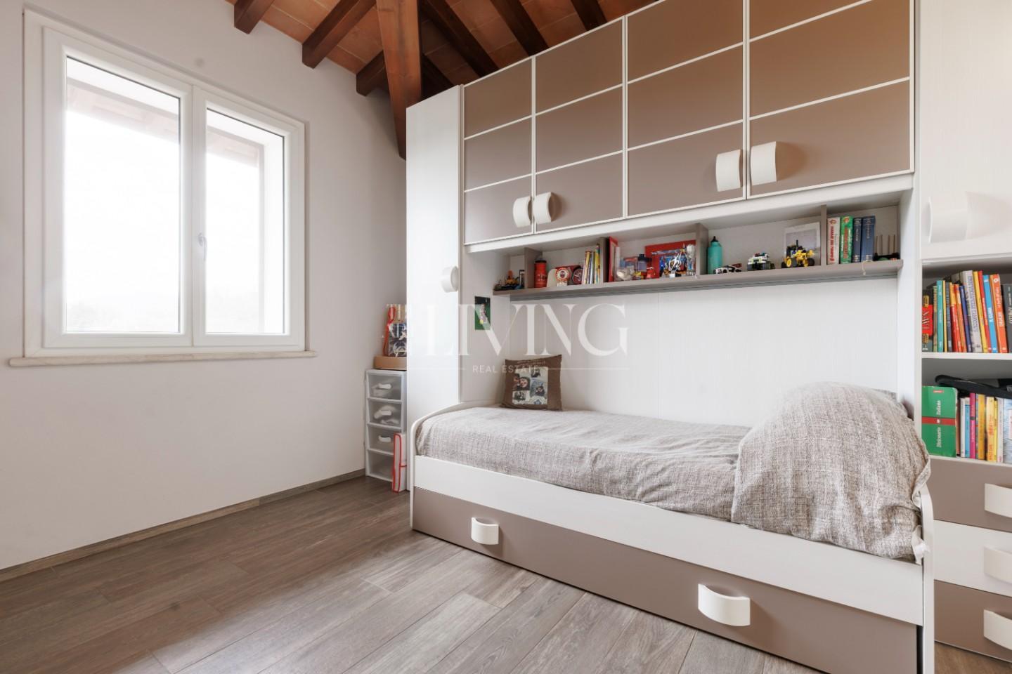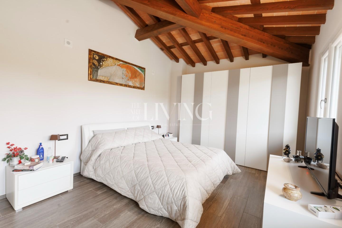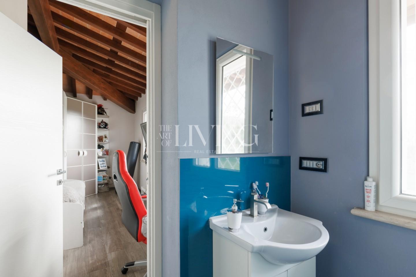 Salendo al piano superiore si accede alla zona notte, dove la camera padronale rappresenta un vero rifugio privato, arricchito da un bagno en suite con vasca idromassaggio. Le altre due camere, insieme al secondo bagno, offrono spazi confortevoli e versatili, ideali sia per la famiglia che per eventuali ospiti.