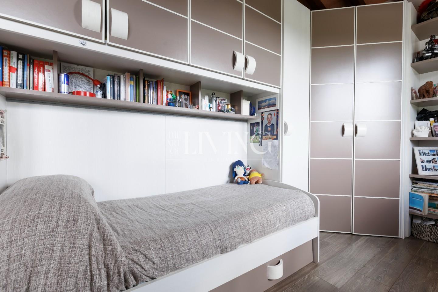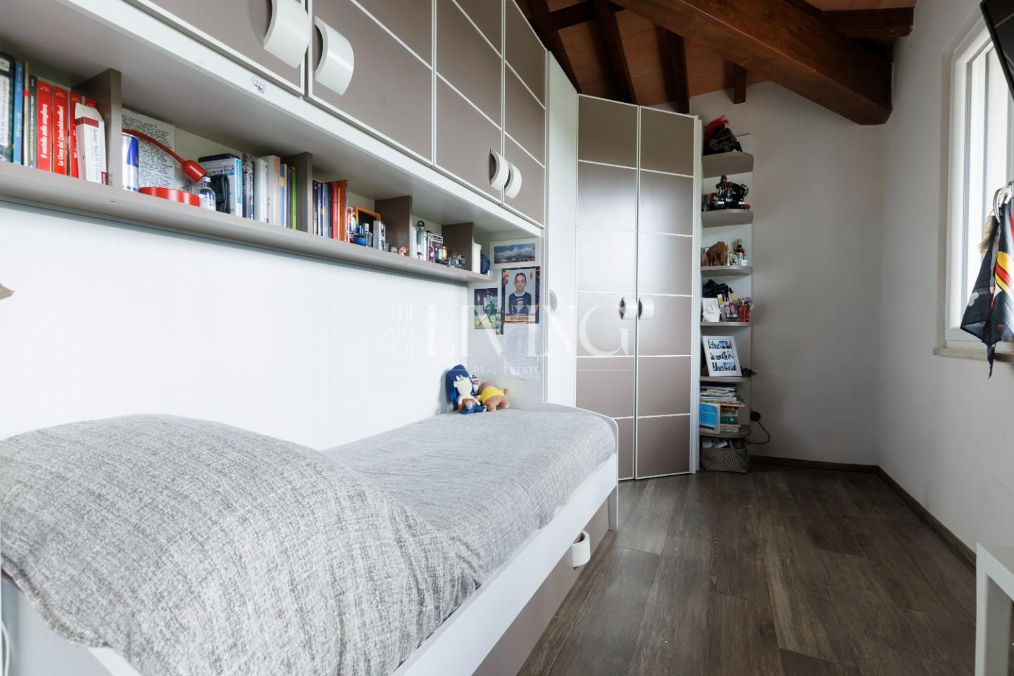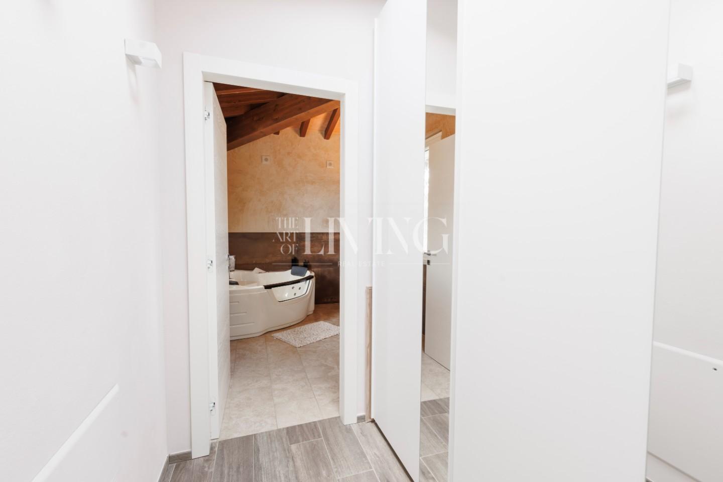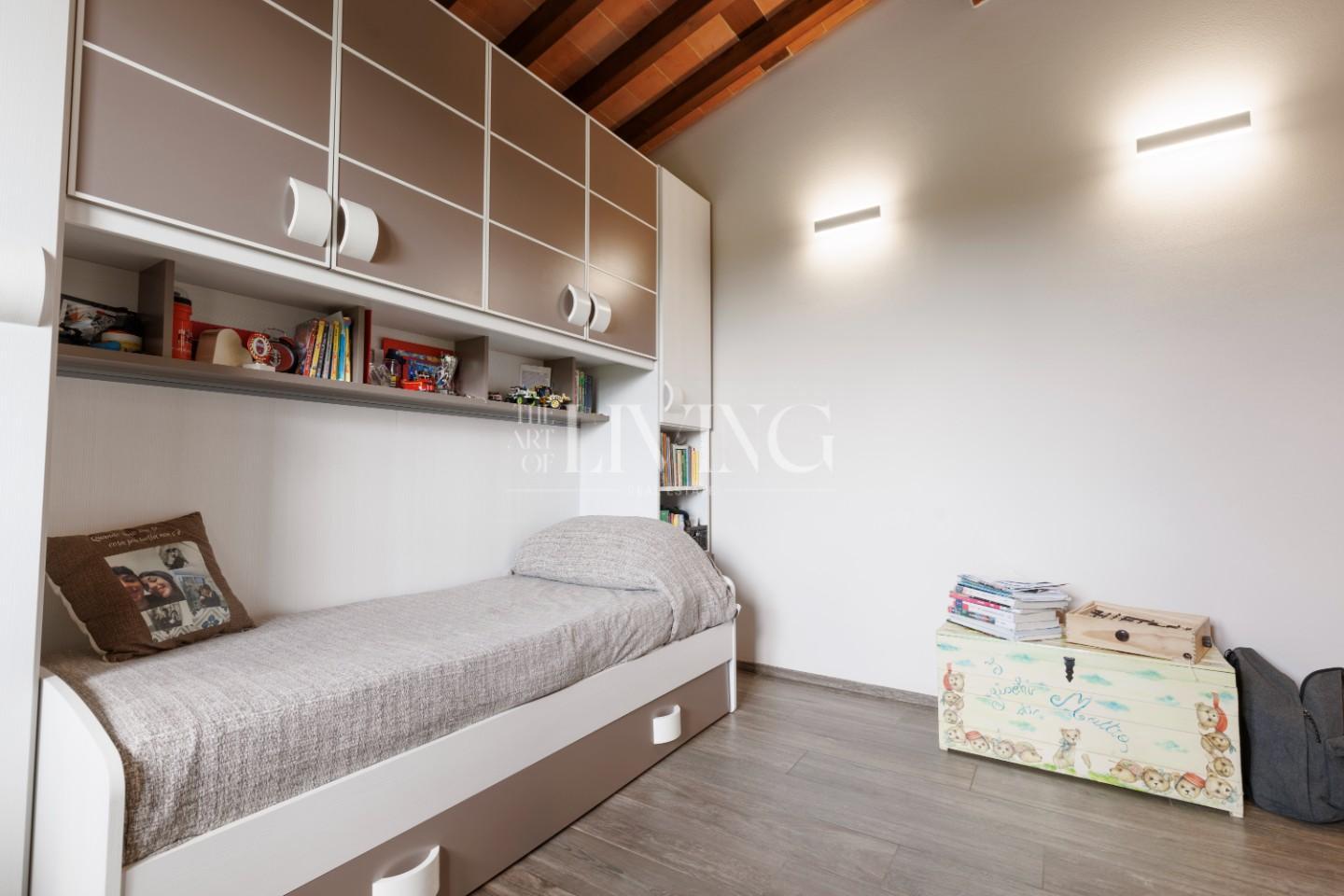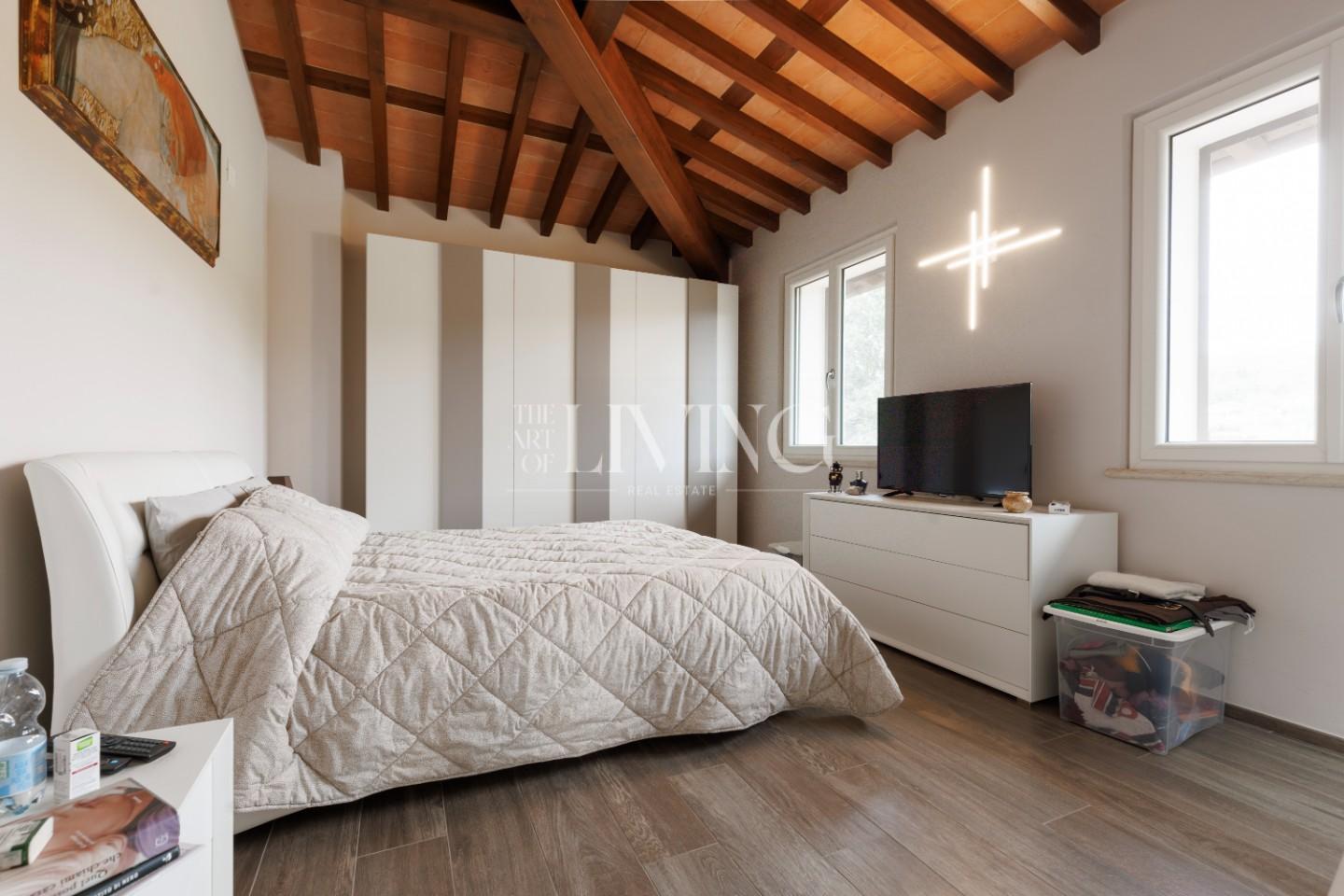 Salendo al piano superiore si accede alla zona notte, dove la camera padronale rappresenta un vero rifugio privato, arricchito da un bagno en suite con vasca idromassaggio. Le altre due camere, insieme al secondo bagno, offrono spazi confortevoli e versatili, ideali sia per la famiglia che per eventuali ospiti.